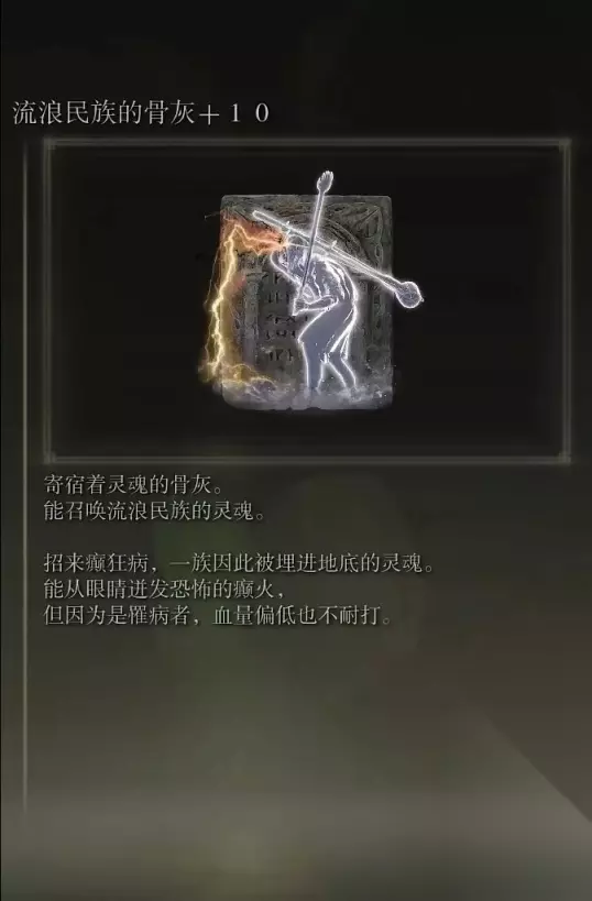 49、流浪民族的骨灰(消耗专注61) 获取方式:王城下水道内探索获得