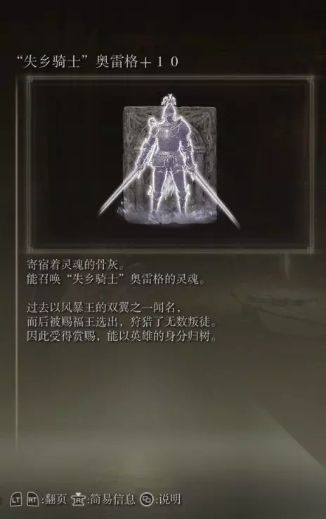 8、失乡骑士奥雷格(消耗专注值100) 获取方式: 在漂流墓地赐福旁边可以用石剑钥匙开启边境英雄墓地,打败最下方的BOSS后获得。