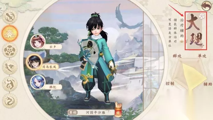 然后啦说说辅助类的选择,首先是大理,这个优点是有着一个极强的恢复能力,而且使以治疗为主要的,其中的万象技能是可以进行群体的治疗的。这个可以同时让我们多个的队友能够恢复一定的生命哦。除此以外还有一个可以直接复活已经死亡的队友的。这个是我们最强烈推荐的辅助类型。然后就是白驼,它也是个辅助能力极强的,它不仅可以让我们的队友有着一些增益的效果,还可以帮着解除不良的一些状态。但是其缺点就是技能十分少。