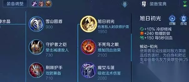 三、新装备 在S31赛季,王者荣耀推出了一款新装备:旭日出光。 这是一件防御型装备,属性包含了物理防御、冷却缩减、回血以及一个被动技能——普攻或技能命中敌人后,可以给自己和队友增加护盾,属于一件通用向的团队型装备,给游戏中非游走位的英雄多了一种出装选择。