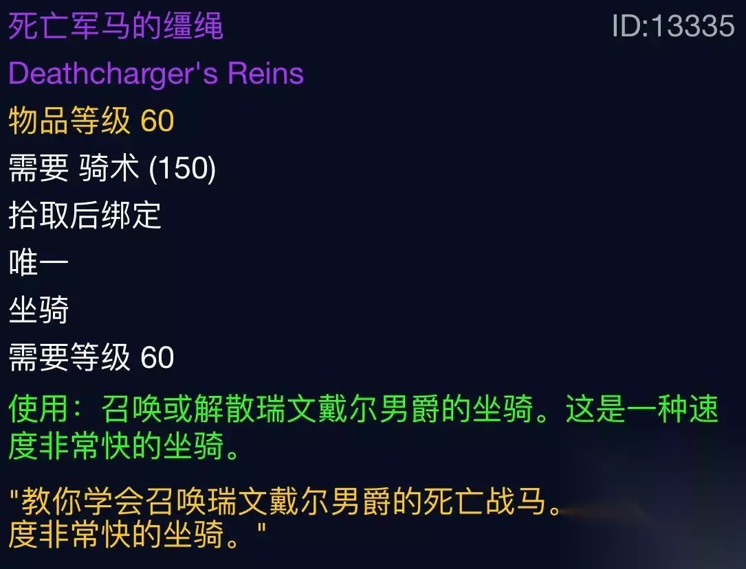 重点来了!死亡军马的缰绳。帅气拉风满满的土豪气息。部落可能对它逊色点,那是因为有骸骨战马。但联盟对它可是垂涎欲滴!多少人为它刷了成千上百次,多少人从60年代刷到80年代。毫无疑问它能和祖格的老虎媲美,老虎好歹掉率比它高。这玩意据说只有百分之零点零一,你值得拥有! 到此为止,下次再出个通灵学院的前世今生。