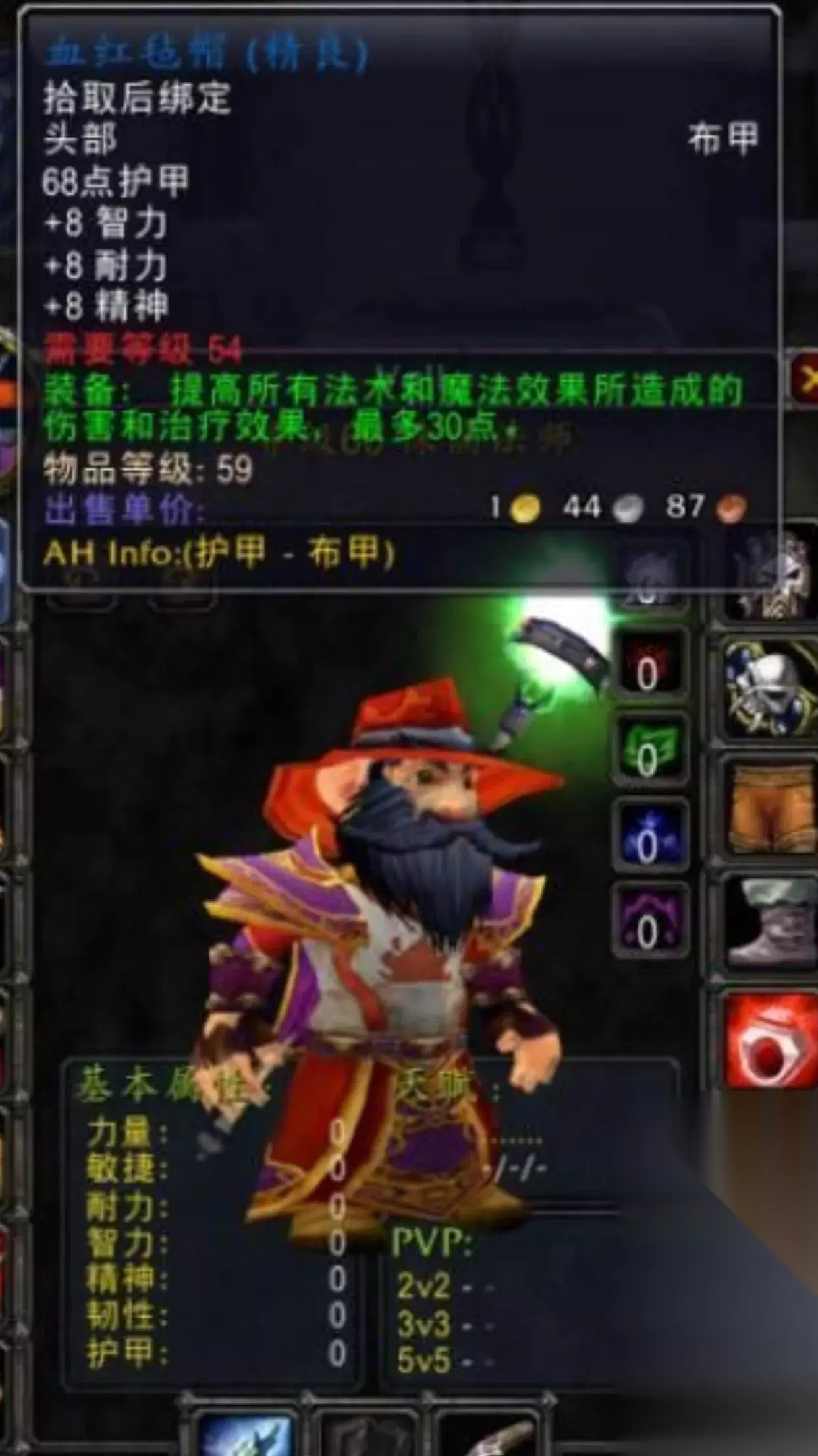 这件物品就很有名气了,血红毡帽也就是大名鼎鼎的小红帽。8耐8智8精30法伤的帽子,除了没暴击能与史诗级掰掰手腕了,团本前必备。很多法系为它不知道刷了多少次镇长!