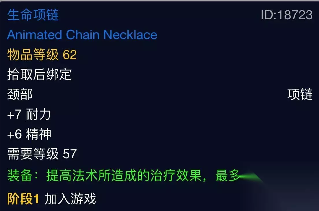 治疗职业前期非常优秀的项链,7耐6精33治疗。我记得曾有个法师Roll走了这个项链,被牧师在世界频道刷了三天。