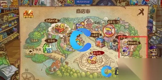 2、在商业街小地图的右侧,找到博得材料屋。