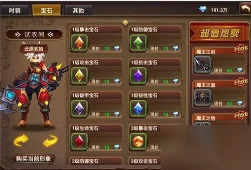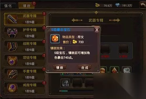 不同颜色的宝石,代表不同的属性:红色代表生命、橘黄代表暴击、绿色代表防御、黄色代表攻击、深紫色代表抗击、淡紫色代表破甲、蓝色代表韧性 相同颜色的宝石根据宝石的不同形状而区分宝石的等级和强度:菱形宝石初始为一级,圆形宝石为二级,正三角形宝石为三级,倒三角形宝石为四级,六边形宝石为五级。目前版本的五级宝石为最高级别。 宝石镶嵌: 点击下方菜单栏中的强化,可以在分页栏中点取镶嵌。这里的镶嵌并不是单纯的镶嵌到装备中去,我们的镶嵌是镶嵌到装备栏中的,所以玩家不再有那些烦恼,每次更换武器的时候还需要将宝石卸载的麻烦。当然通过这里玩家可以将低级宝石合成更高一级的宝石。这里合成的规则是四颗低级宝石可以合成一颗高一级的宝石。