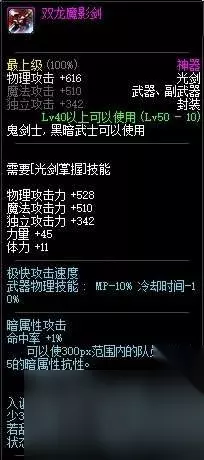 3.双龙魔影剑(黑光) 笑笑孙亚龙的成名武器,大风起兮云飞扬,黑光剑圣杀四方。黑光的外形实在太帅了,一把黑色的光剑,站街巨拉风。而且属性也不差,自带暗属性攻击,诅咒效果在PK场也是非常实用。