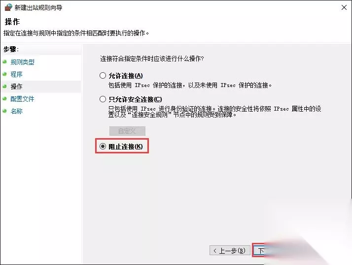5、选择 阻止连接,点击 下一步。