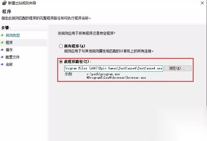4、点击浏览,选择正当防卫游戏安装目录下的 JustCause4.exe 文件,点击 下一步。