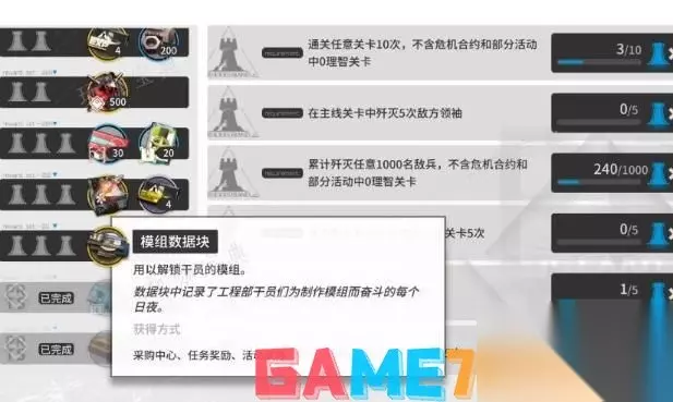 模组数据块获取方法: 1、采购中心: 2、任务奖励:每周任务的最后一环会给一个,一个六星解锁模组需要4个; 3、活动获得:在游戏中参加活动奖励获得。