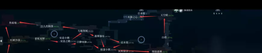 二、探索顺序推荐 1、首先在【红树沙漠】拿到爬墙和砸地,然后去翡翠瀑布下面放逐小镇打完法师拿到哨子; 2、之后从【大地领域】去【巨人的陨落】,也可通过【大地领域】和【彩虹原野】去巨人陨落了; 3、去水之领域之后到王城找猫头鹰,之后从细语森林前往昔日之森; 4、最后打完白塔天空殿、灰烬火领域、水之领域升级至69级才前往王城。