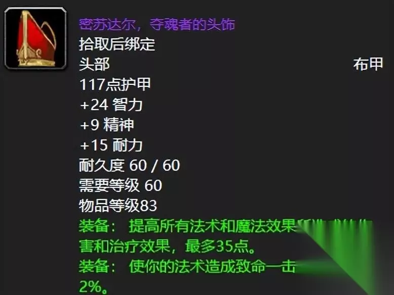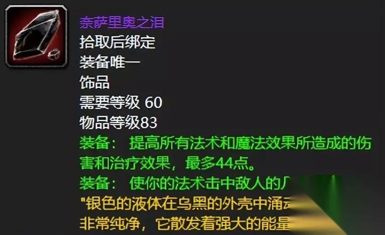很难相信,一个第三阶段团本的饰品,竟然是版本毕业的存在,甚至是到了燃烧的远征初期依旧卸不下来的存在,毕竟2%的命中以及恐怖如斯的44点法伤足以让它戳天花板了,巅峰那是自然。