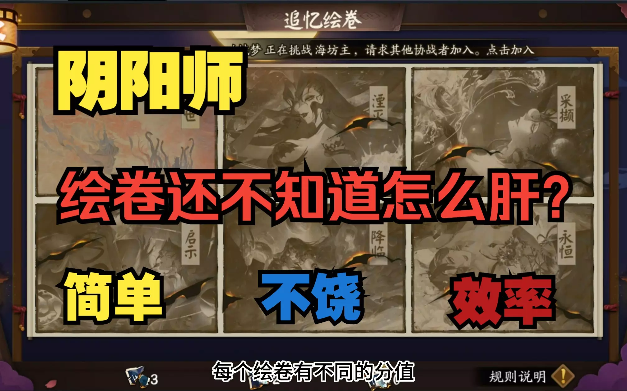 这是《阴阳师》的高效率肝绘卷攻略,提到可单刷御灵之境获取绘卷,所有副本都掉落小绘卷,助力玩家快速完成追忆绘卷任务,提升个人贡献排名。