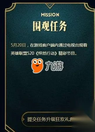 玩家们都是冲着围观任务来的吧?很多玩家想完成季中赛活动任务升级礼盒,也有很多玩家比知道《围观任务》是什么? 不知道围观任务及季中赛活动的玩家点击此处活动:查看详情 想必玩家们都迫不及待的想知道或者观看在5月20号的英雄联盟520《怦然心动》直播吧? 英雄联盟520《怦然心动》直播 直播地址分享:敬请期待↓↓↓及时更新 这个活动5月20日才会有。如果你们真心希望参加这个活动。就收藏小编的页面。到时候小编一定会更新的。收藏(ctrl D) 在2017季中狂欢活动中有相关任务,下面为玩家们介绍下: 围观任务介绍 5月20日,在游戏客户端内通过电视台观看英雄联盟520《怦然行动》精彩节目。 收集任务介绍 收集狂欢勋章:狂欢勋章可在对应时间段内通过QQ会员、黄钻、绿钻、腾讯视频活动获得。通过狂欢勋章获得的礼盒升级机会只有一次,在多个平台获得的勋章不能重复升级礼盒
