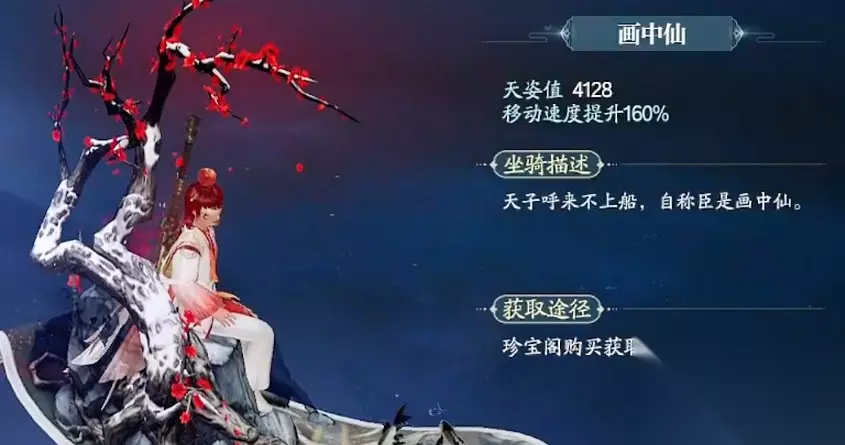 最后,还有一款非常值得注意的坐骑——“画中仙”。这只飘逸的坐骑像是从古老画卷中走出来的,它不仅外表优美、立体感十足,还拥有4128的天资值和160%的飞行速度加成。通过珍宝阁购买,玩家可以轻松带回这位如梦如幻的伙伴。