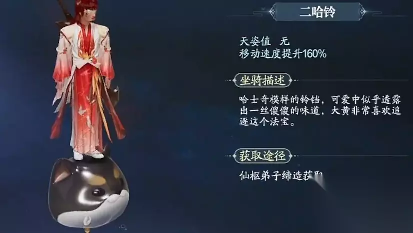 至于那些更具俏皮感的坐骑,“二哈铃”是其中最具趣味性的。它看起来像极了一只憨态可掬的哈士奇,带着一丝傻傻的萌态,简直就是大黄的最佳玩伴。这款坐骑同样没有天资值,但依然能提升160%的移动速度。而且,玩家也可以通过仙枢弟子缔造的方式将它收入囊中。