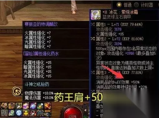 5、增伤药剂 典型代表如:斗神之吼(12%增伤)、冒险团属强药(10全属)、特调酷饮(5全属)。 获取途径:拍卖行、冒险团、商城等;主要疗效:增伤。 比较常见的、且提升较大的消耗品,没什么好说的,如果一定要说110版本有什么改版,那就是在“药王头肩”加持下,提升非常大。