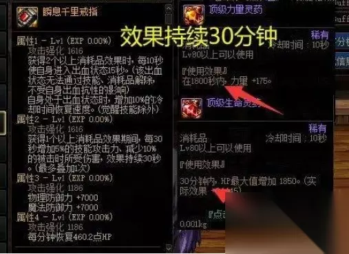 3、顶级力量/智力/生命/魔力灵药 获取途径:拍卖行,9000金币/个(以顶级力量药为例); 主要疗效: 175力量,持续时间1800秒。 持续时间1800秒,好处在于,可以用来触发“自异常的装备”,比如出血戒指,需要吃2个消耗品使自身进入出血状态,如果吃其他药,几分钟就过期了,增加成本不说,还麻烦得很。但如果吃顶级力量/生命药,除了增加蚊子肉属性提升外,最重要的是,这个持续30分钟,不管是撤退、攻坚失败、换角色、换频道、甚至掉线重登,它依然是有效的。