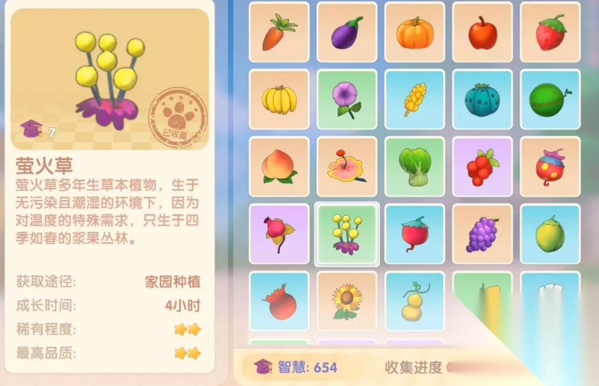 【植物图鉴大全】 萤火草介绍: 获取方法 1、萤火草属于中低阶花草植物,需要农场主等级到达25级。 2、等级到达之后点击主界面右上角的梅森的花园商店。 3、在里面找到萤火草的种子购买即可。