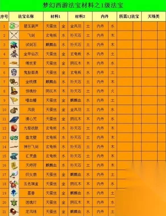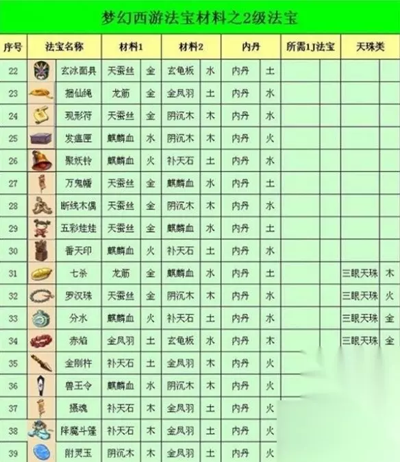 2、以下是根据不同门派的玩家实践所收集的材料摆放位置,仅供参考: 金 水:内丹土位 金 木:内丹水位 金 土:内丹水位 木 水/土:内丹火位 水 土:内丹木位 金 水:材料放置火位时,内丹需放置土位,不能放在木位。 3、接下来,我们通过三个具体的法宝实例来详细说明: (1)降魔斗篷 材料1:补天石(土) 材料2:金凤羽(火) 内丹:金 三眼天珠:水 通过这些材料和内丹的组合,可以制作出降魔斗篷。 (2)降魔斗篷(另一种组合) 材料1:补天石(土) 材料2:金凤羽(火) 内丹:水 三眼天珠:金 同样可以制作出降魔斗篷。 (3)月光宝盒 材料1:玄龟板(水) 材料2:补天石(土) 内丹:木 飞剑:金通过这些材料和内丹的组合,可以制作出月光宝盒。 (4)镇海珠 材料1:麒麟血(水) 材料2:玄龟板(木) 内丹:火 飞剑:金 九眼天珠:土通过这些材料和内丹的组合,可以制作出镇海珠。 -end-