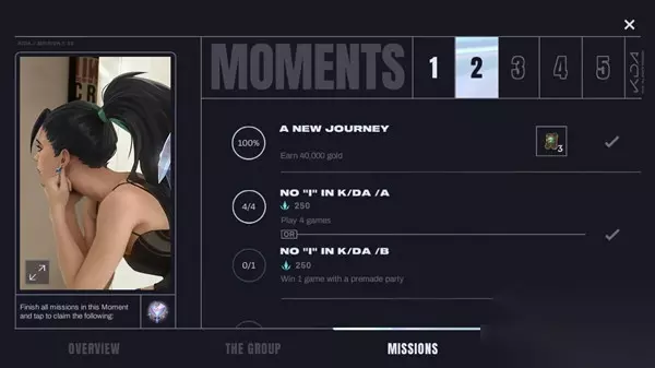 实际上,premade party就是指预先组建起来的队伍,也就是说要求玩家组队开黑进入比赛,而后win(赢)一把就可以满足这个任务的要求啦。 注意,卡莎的第二天任务中的开黑任务上面还用一个OR连接起了另外一个任务,所以这里就等于是两项任务二选一达成即可,不做开黑任务的也可以做玩4局游戏,同样也算是完成的。