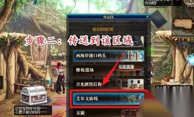 2.dnf特殊能量隐藏装置获得步骤二:进入赛利亚房间以后,向右移动到传送门。打开传送列表以后,选择“艾尔文防线”进行传送。