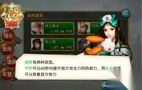 关于援军,还有三条至关重要的提示,小编在这里也透露给各位玩家。首先是每场作战开始前邀请援军的过程中,玩家的好友都会被优先考虑,但系统会以登陆时间的先后来排名,也就是说离玩家此刻游戏的时间点为基准,越近接此时间登陆的好友就会排序靠前,如果某好友连续几天都未登陆,则无法看到其出现在援军名单中。此外,援军虽然有等级显示,但实际游戏过程中,该援军武将的等级是以玩家自身军团武将的平均等级来划定,所以即使选择了LV60的吕布或关羽,自己军团的平均等级不高也是很难做到轻松攻略关卡的。