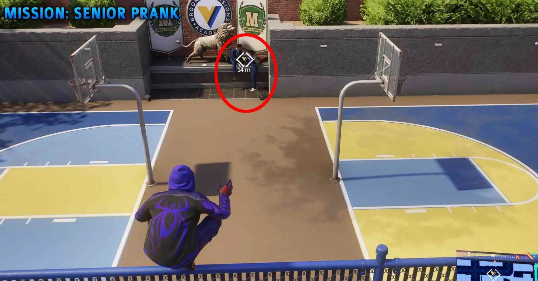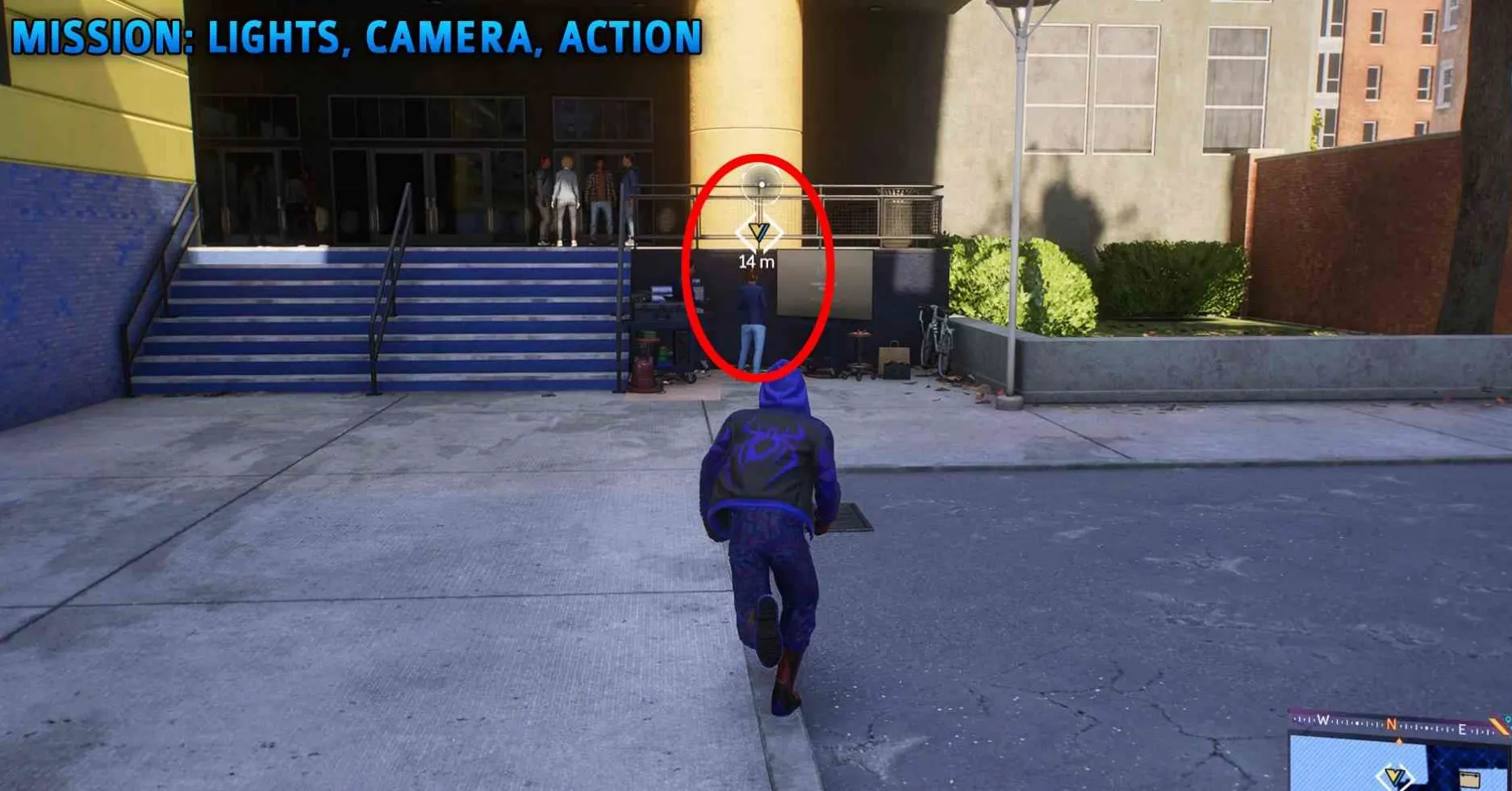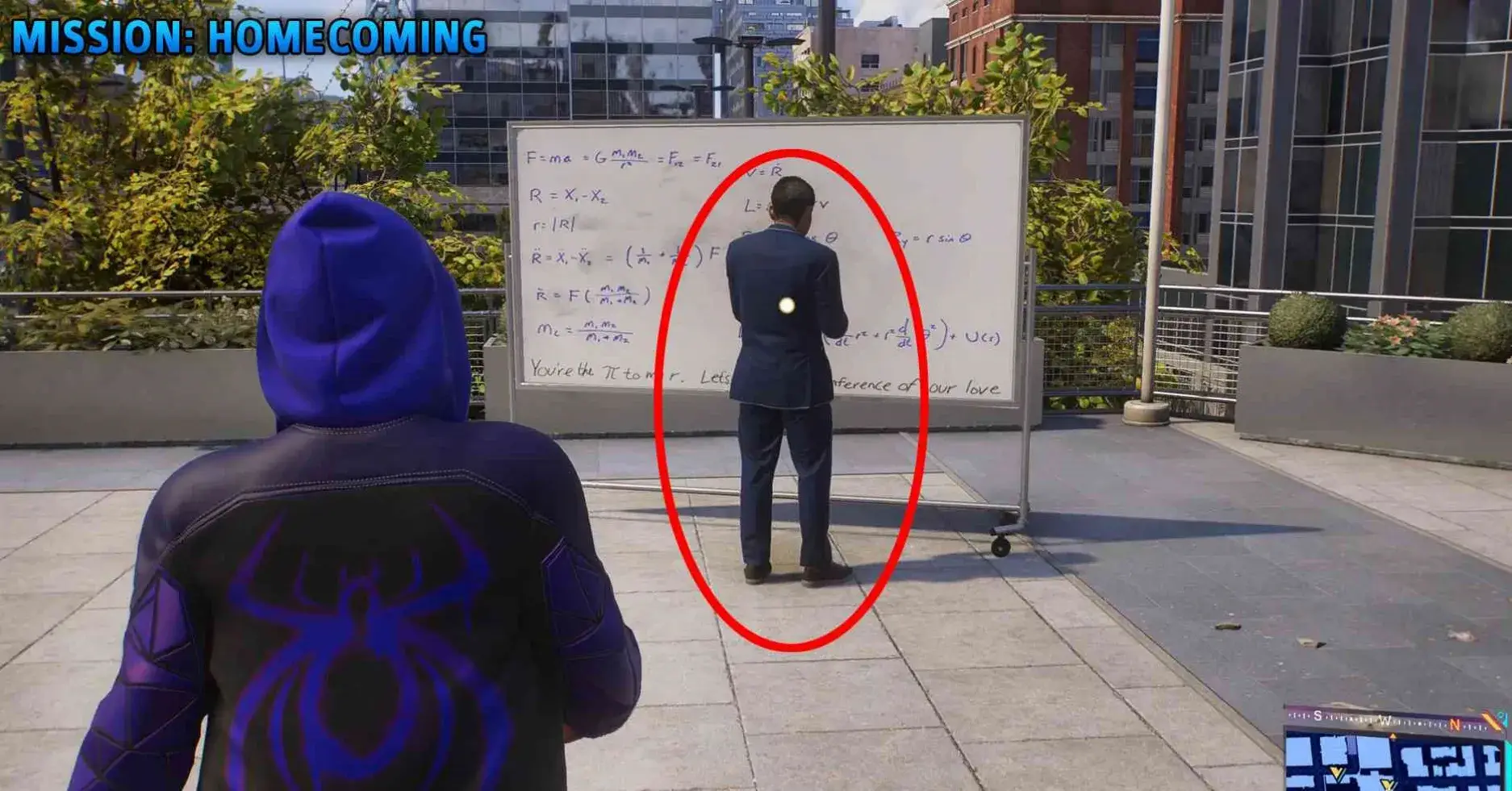 就呆在那里听,直到过场动画触发,迈尔斯换回他的服装