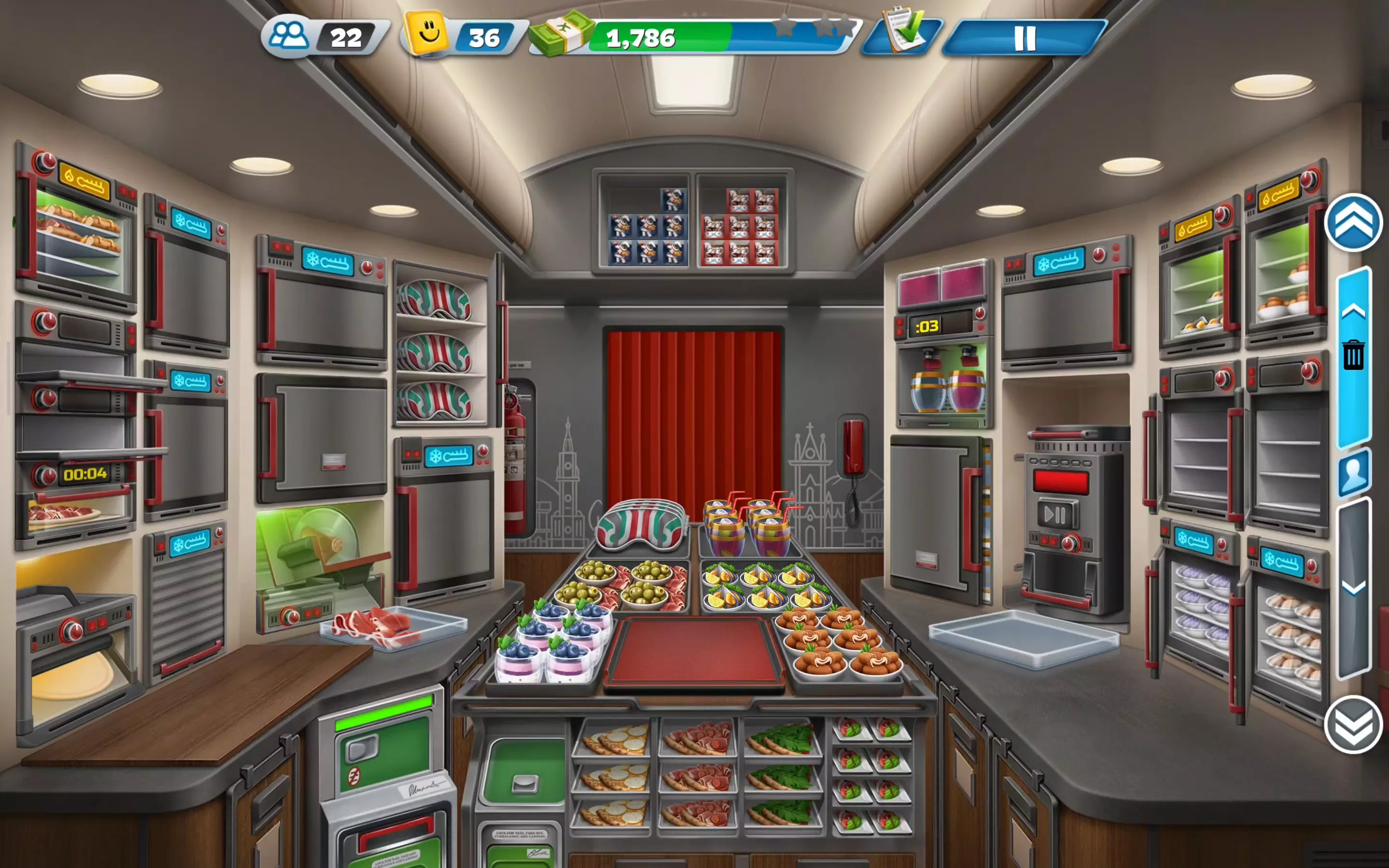 这是《飞机大厨》开普敦24关的通关视频,该关卡难度较高,视频展示了在飞机餐舱内制作、供应餐食,满足乘客需求完成关卡的过程,操作流畅,完成关卡后获得了相应收益。