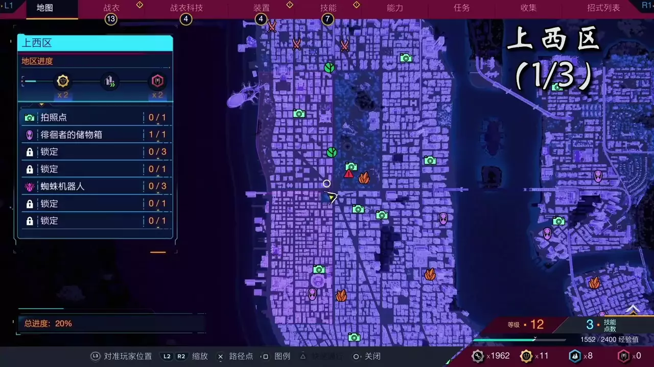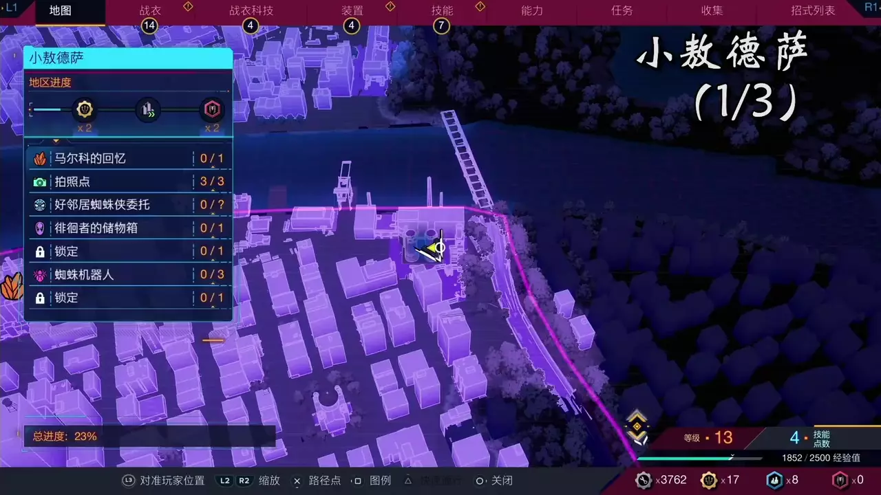 这是转自B站玩家酷热火君的《漫威蜘蛛侠2》地狱厨房区域蜘蛛机器人收集攻略内容,展示了该区域的地图及蜘蛛侠前往收集点的过程,该区域蜘蛛机器人已完成3/3的收集。