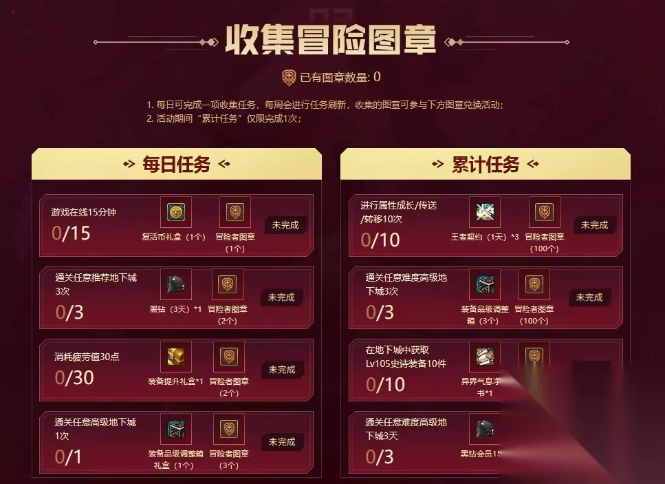 3、完成任务获得的幸运冒险家图章可以用于兑换奖励,可兑换奖励包含灿烂的徽章神秘礼盒、+7装备增幅券、华丽的徽章神秘礼盒、王者契约礼包、装备提升礼盒、装备品级调整箱、黑钻等道具。