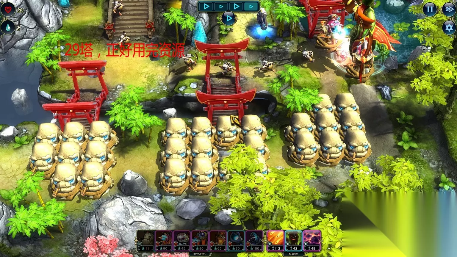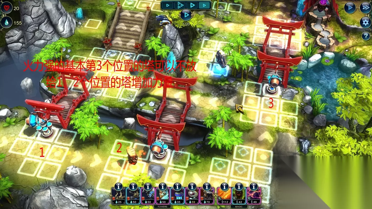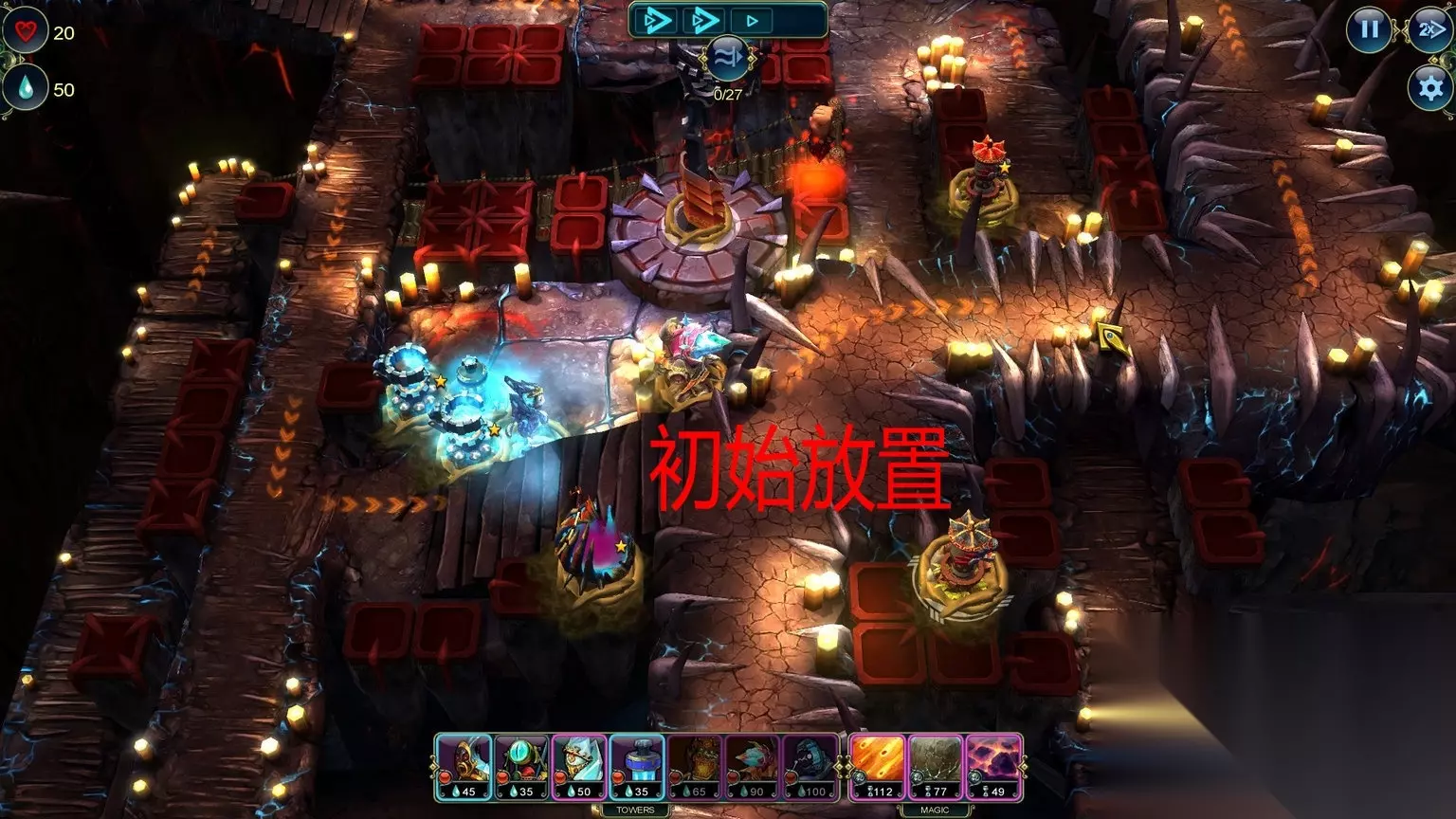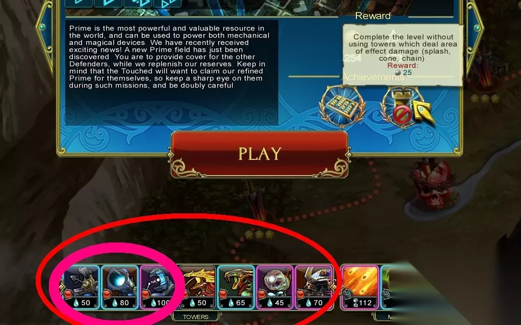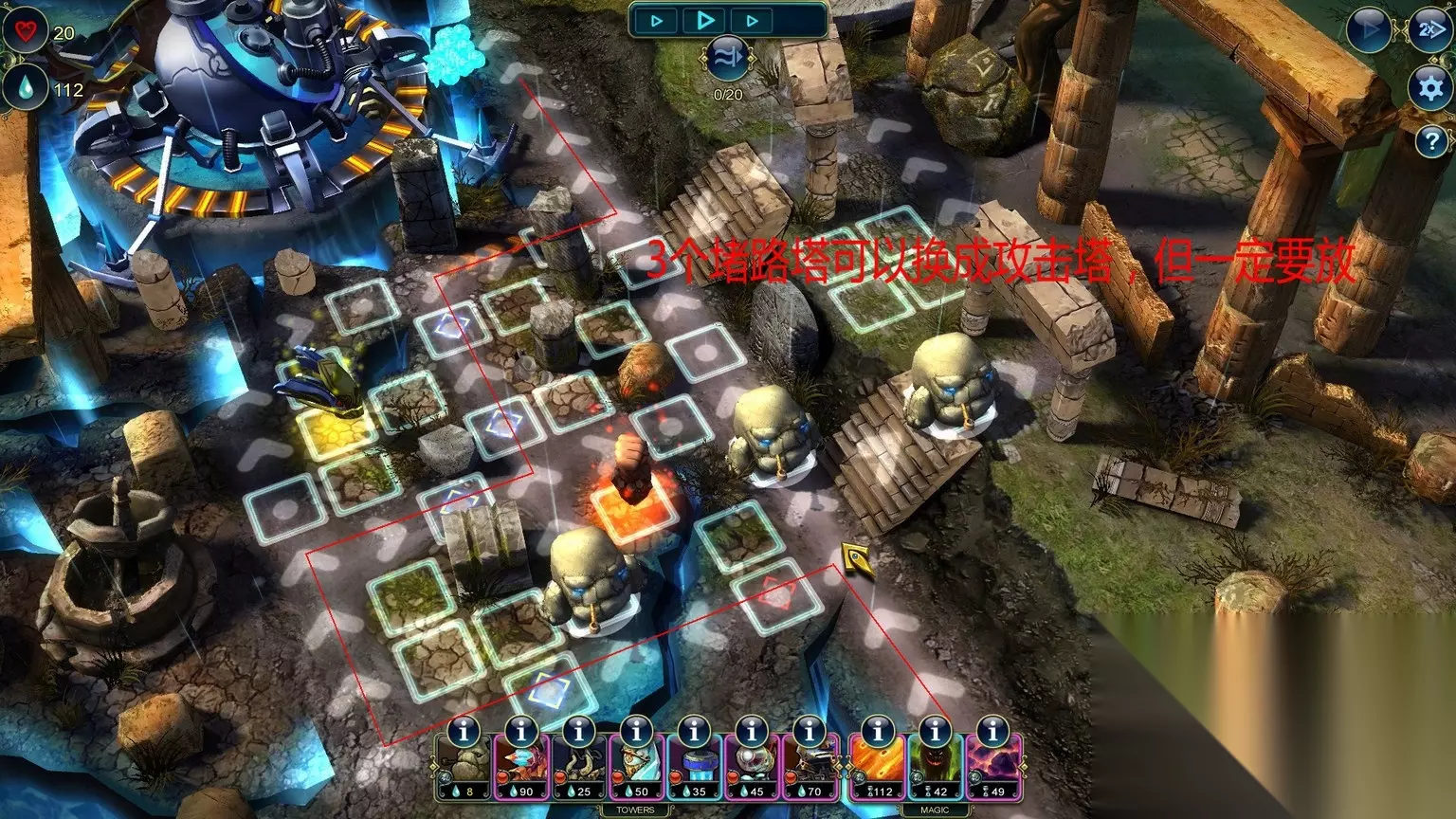 Economics (Level 15) Save 150 Prime by the end of the level. Master Strategist (Level 15) Complete the level without using a Stone Tower. 通关不用石头塔/通关最少剩150资源 石头塔,这个是在箭塔和攻城塔中间的过度塔,没有抽到电塔和龙塔这个可以用做替代,我单独做出说明。 这关又是多入口,推荐如图放防御塔。