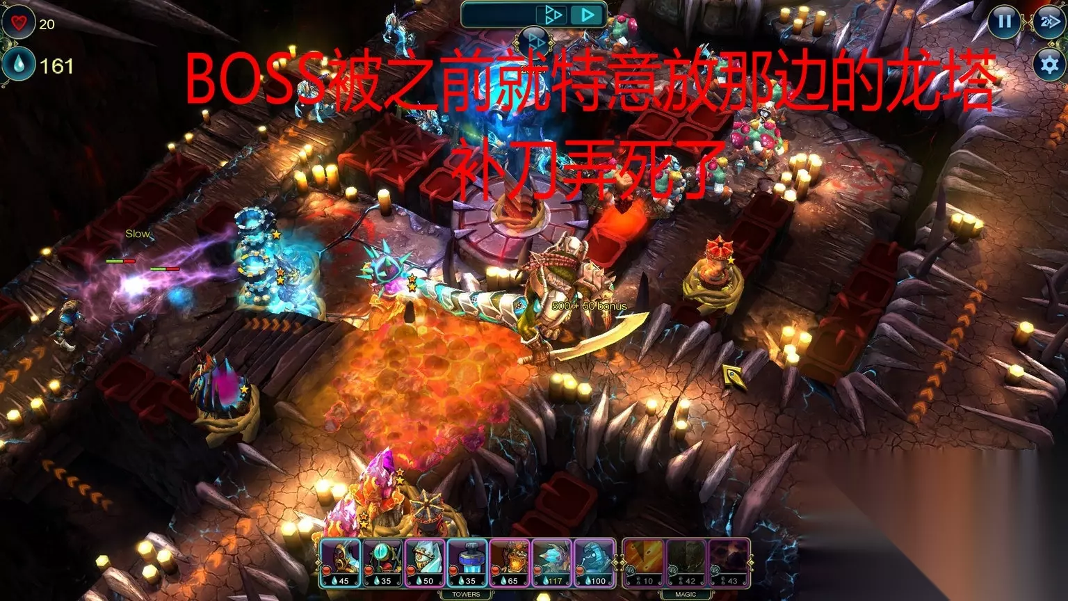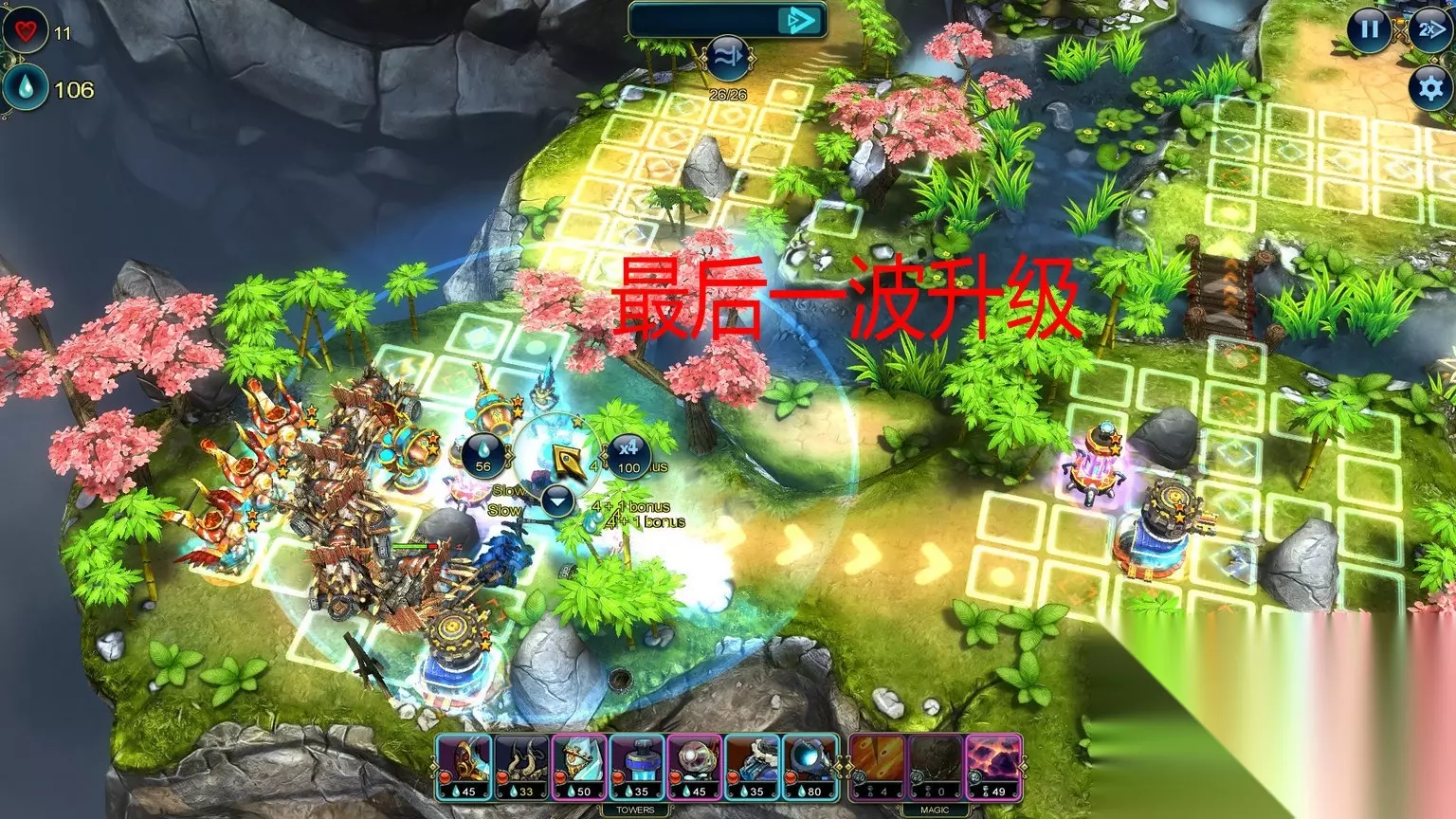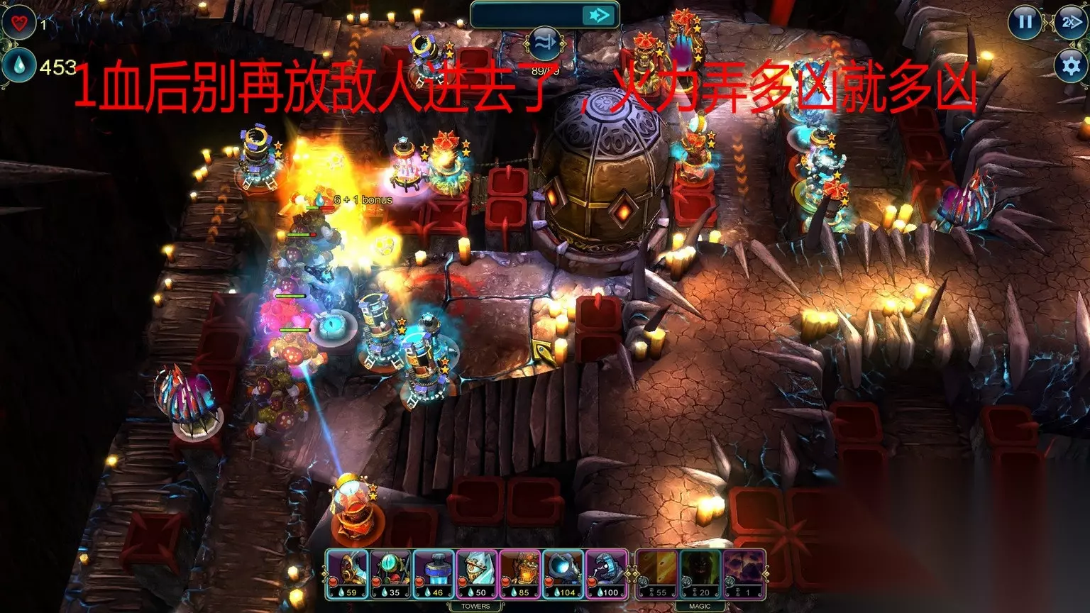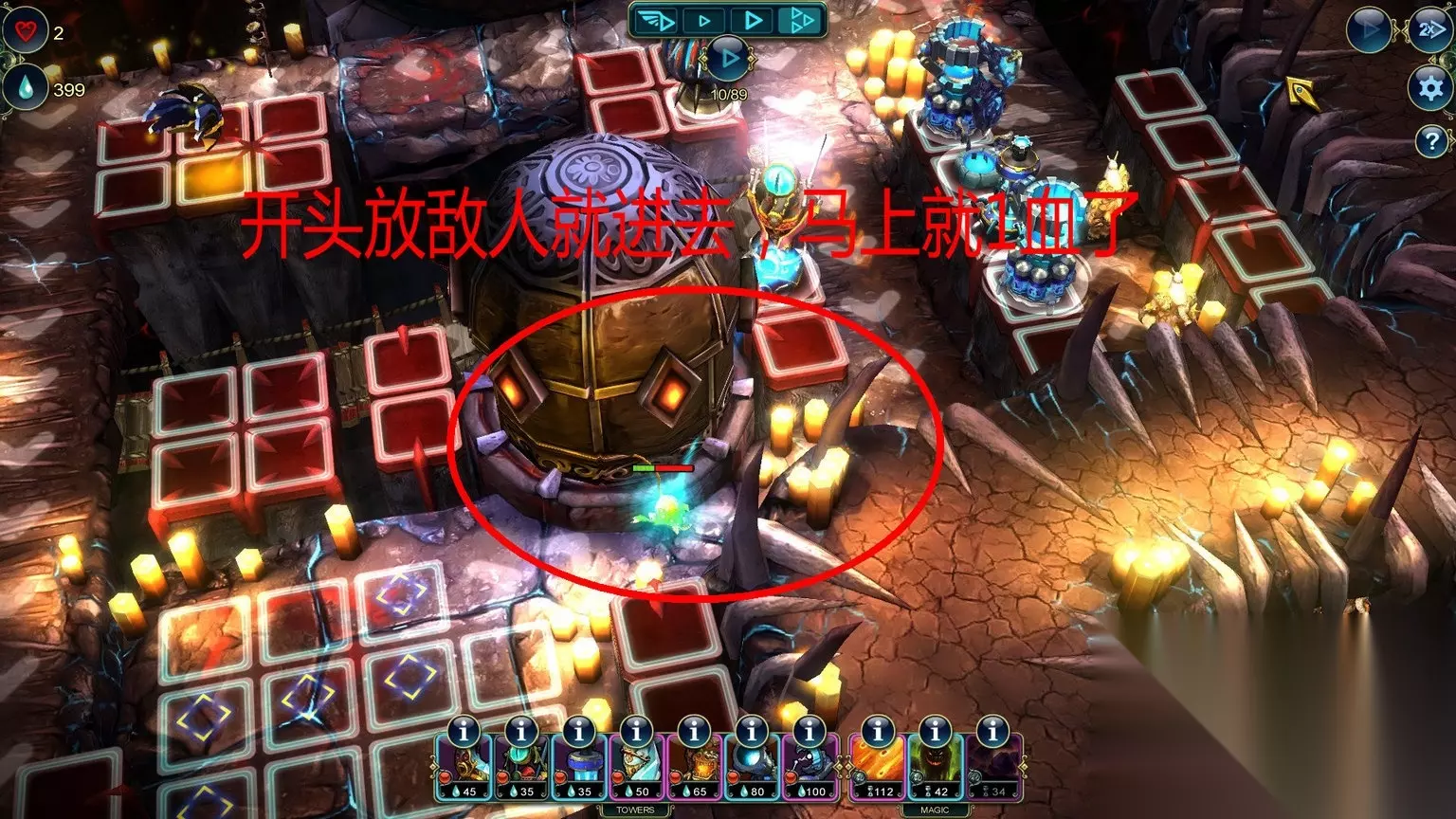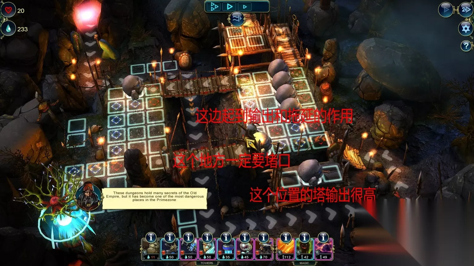 Economics (Level 15) Save 150 Prime by the end of the level. Master Strategist (Level 15) Complete the level without using a Stone Tower. 通关不用石头塔/通关最少剩150资源 石头塔,这个是在箭塔和攻城塔中间的过度塔,没有抽到电塔和龙塔这个可以用做替代,我单独做出说明。 这关又是多入口,推荐如图放防御塔。