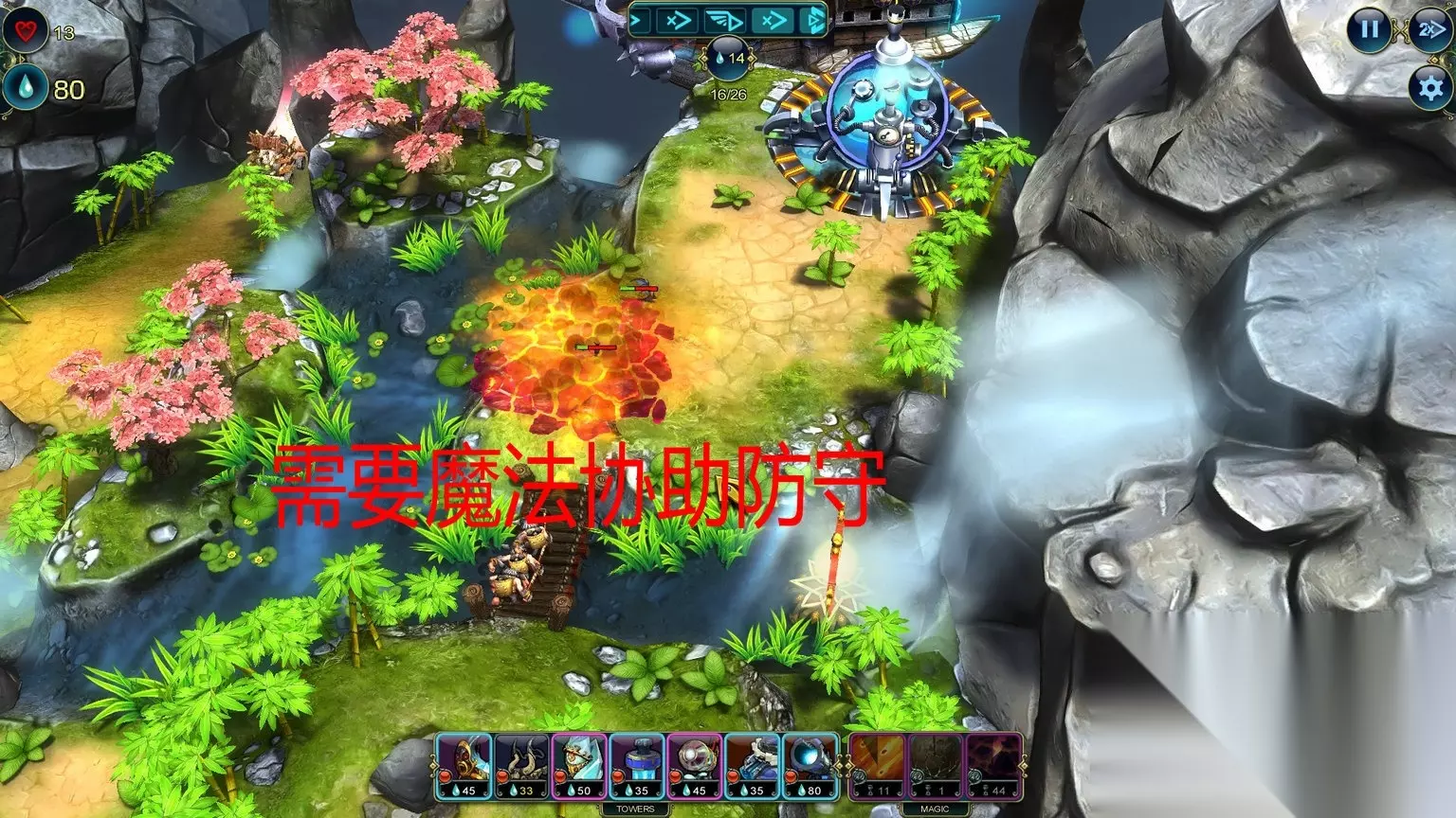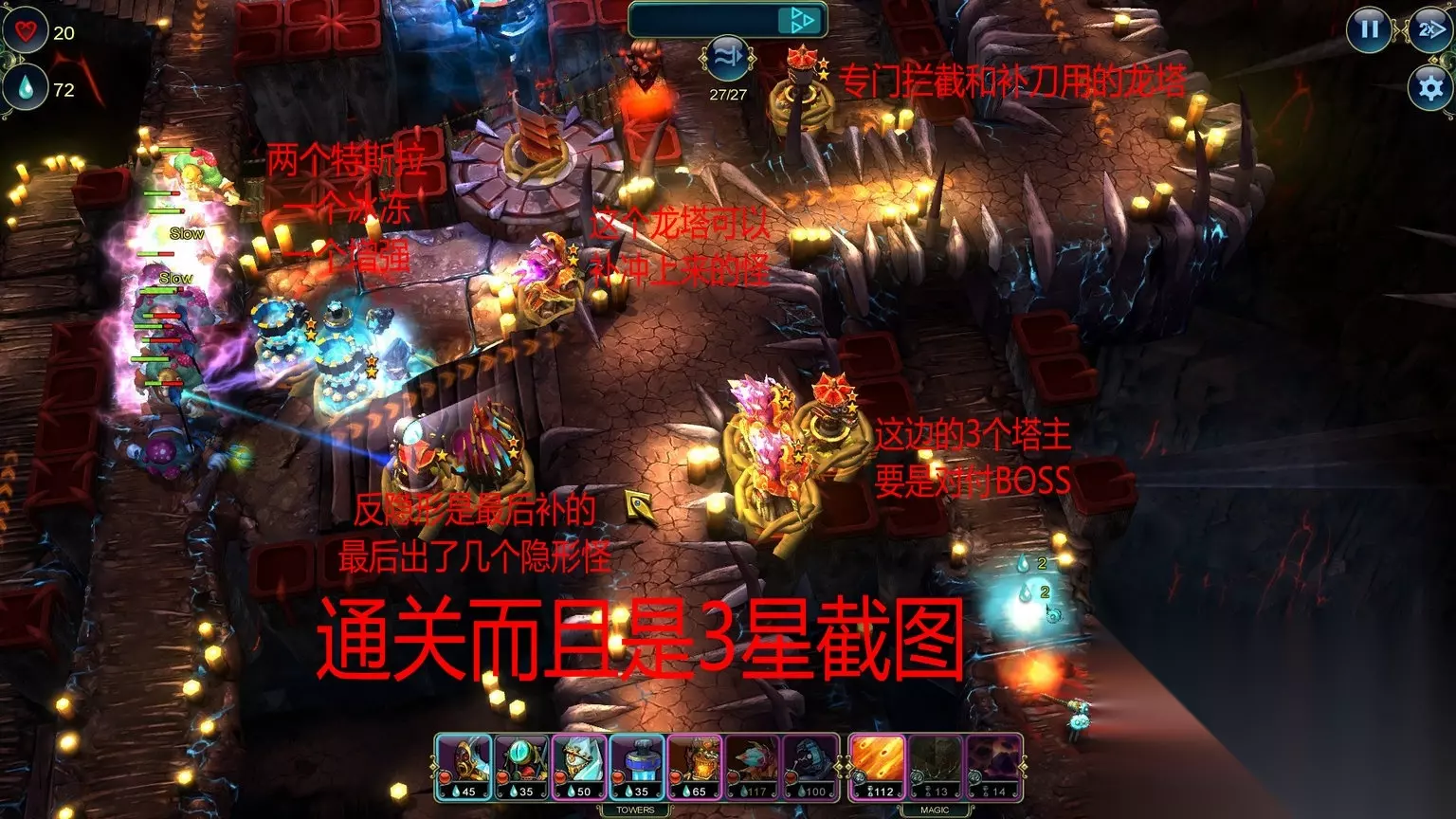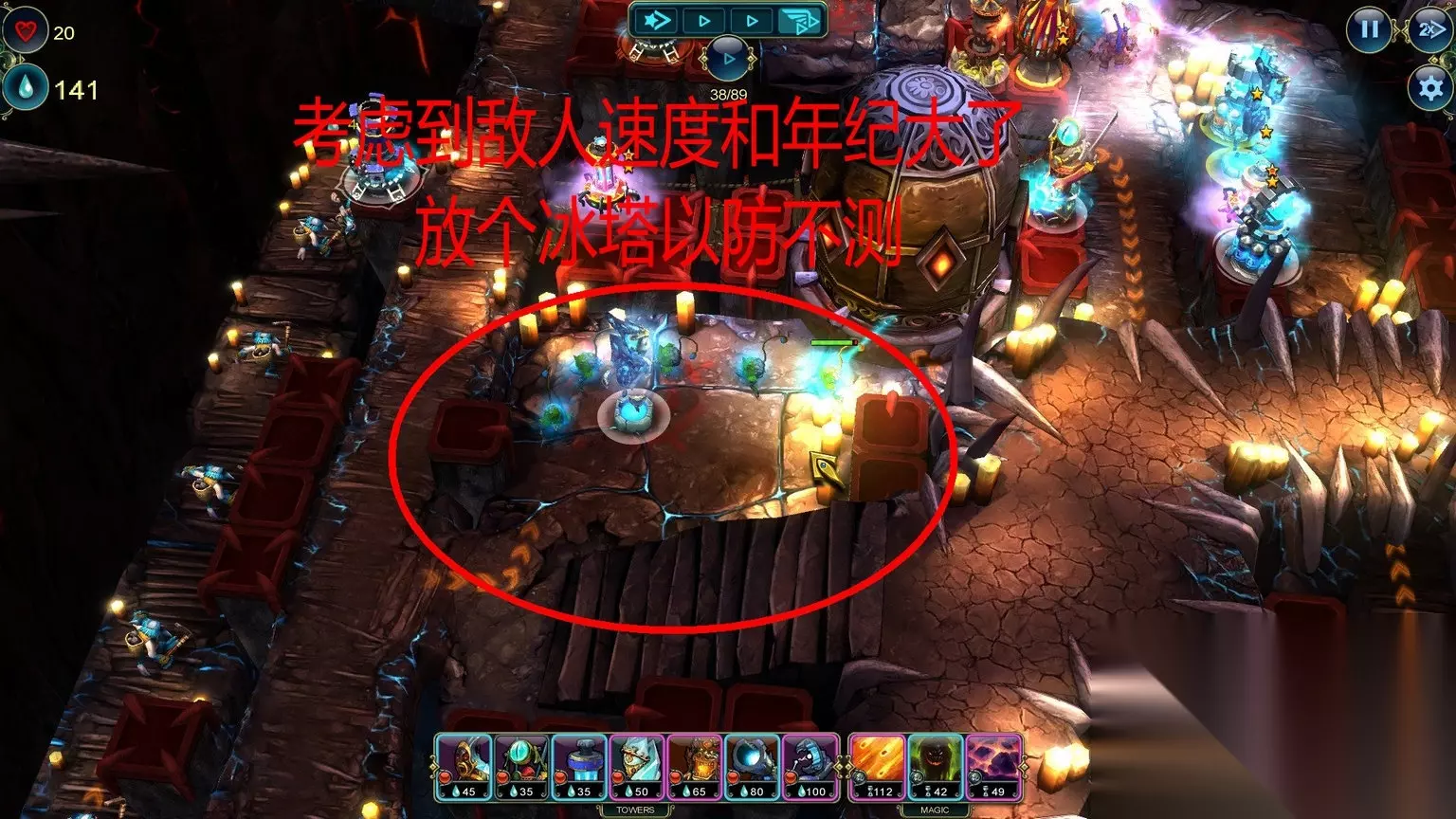 Master Strategist (Level 6) Complete the level without using the Wooden Tower. Totem Destroyer (Level 6) Destroy 7 totems. 不用木头塔,破坏7个占位塔。 初始的那5种塔都是木头塔,但这关要你不用的是箭塔,其他的木头塔还是可以用的。箭塔也是时候舍弃了,那个攻击力低的吓死人 Cold Calculation (Level 7) Complete this level with under 13 towers. Lesser Magic (Level 7) Complete this level using magic no more than 3 times. 通关造了至少13座塔/不用超过3次魔法(这游戏里面不超过包括了3次) Master Strategist (Level 8) Complete the level without using Magic light. Economical (Level 8) Save 200 Prime by the end of the level. 通关不用魔法/通关时候还剩最少200资源 Totem Destroyer (Level 9) Destroy all totems in the battle. Master Strategist (Level 9) Complete the level without using towers which target only air enemies. 破坏了所有占位塔/不允许使用只对空塔 No Magic (Level 10) Complete the level without using any magic. Master Strategist (Level 10) Complete the level without using the Fire Tower. 通关不用魔法/通关不用火塔 Master Strategist (Level 11) Complete the level without using the Siege Tower. Economical (Level 11) Save 150 Prime by the end of the level. 通关不用攻城塔/通关时候最少剩余150资源 Provocation (Level 12) Summon Next Wave 5 times in the battle. Only Pawns (Level 12) Complete the level without upgrading a tower. 快速呼唤敌人最少5次/通关不能升级塔 Mechanic (Level 13) Upgrade 5 towers to level 3. On the Verge (Level 13) Complete this level with 1 life. 升级5塔到3级/通关时候只剩1点生命 这关开始有恶心的成就,不过比起后面困难模式的来说就非常简单了 Battle Mage (Level 14) Inflict 5000 damage using magic. Builder (Level 14) Build 30 towers during battle. 用魔法造成5000点伤害/放置30座塔 如图把三个口子堵住,推荐使用炮塔、冰塔、攻城塔配合,有一裤衩资源富裕,足够通关前放30个堵路塔的。 这些魔法的伤害很高