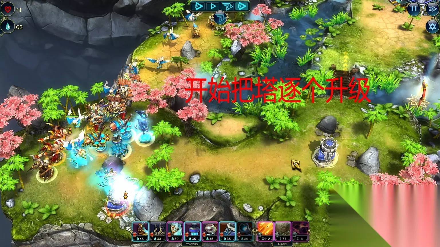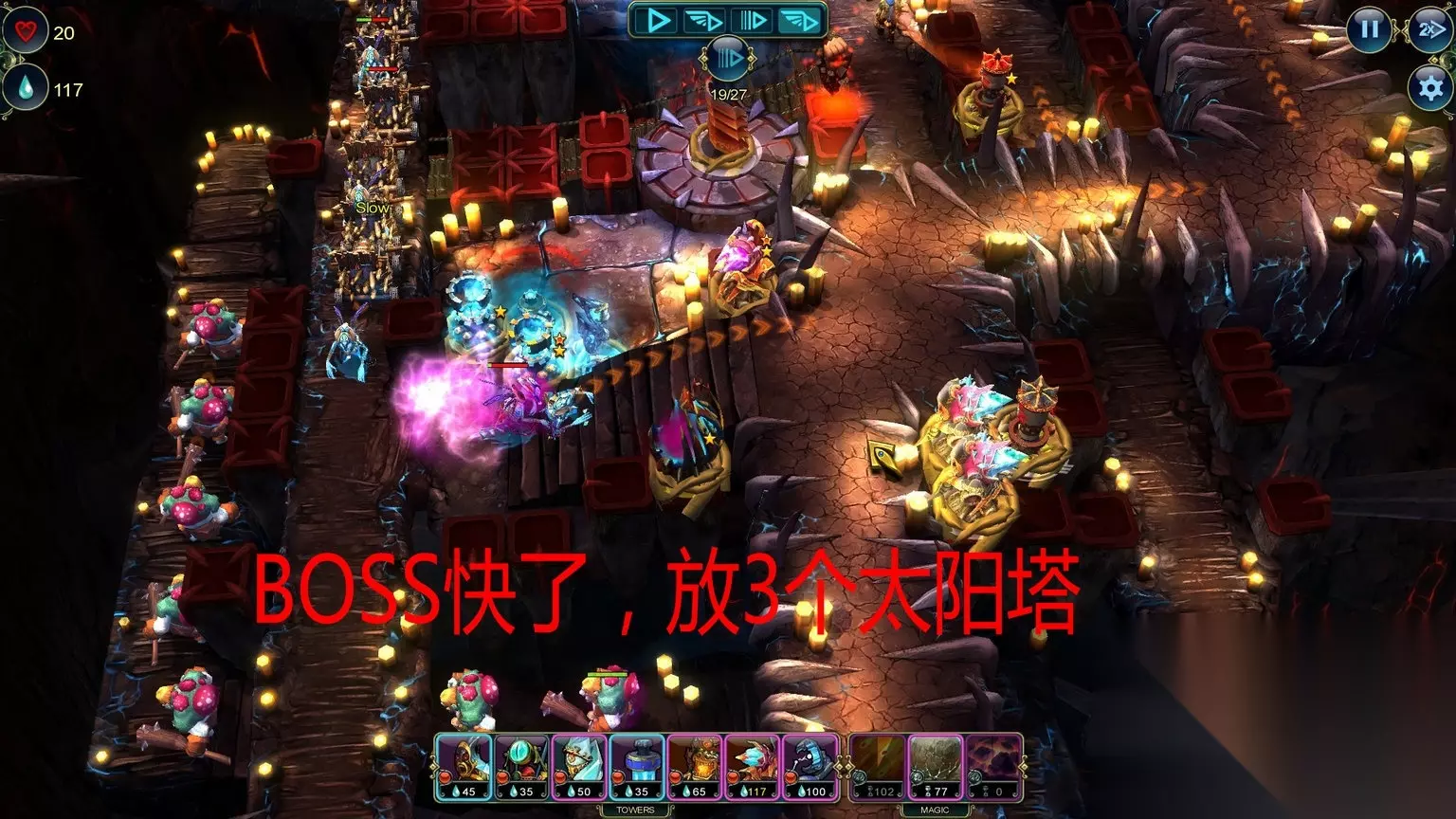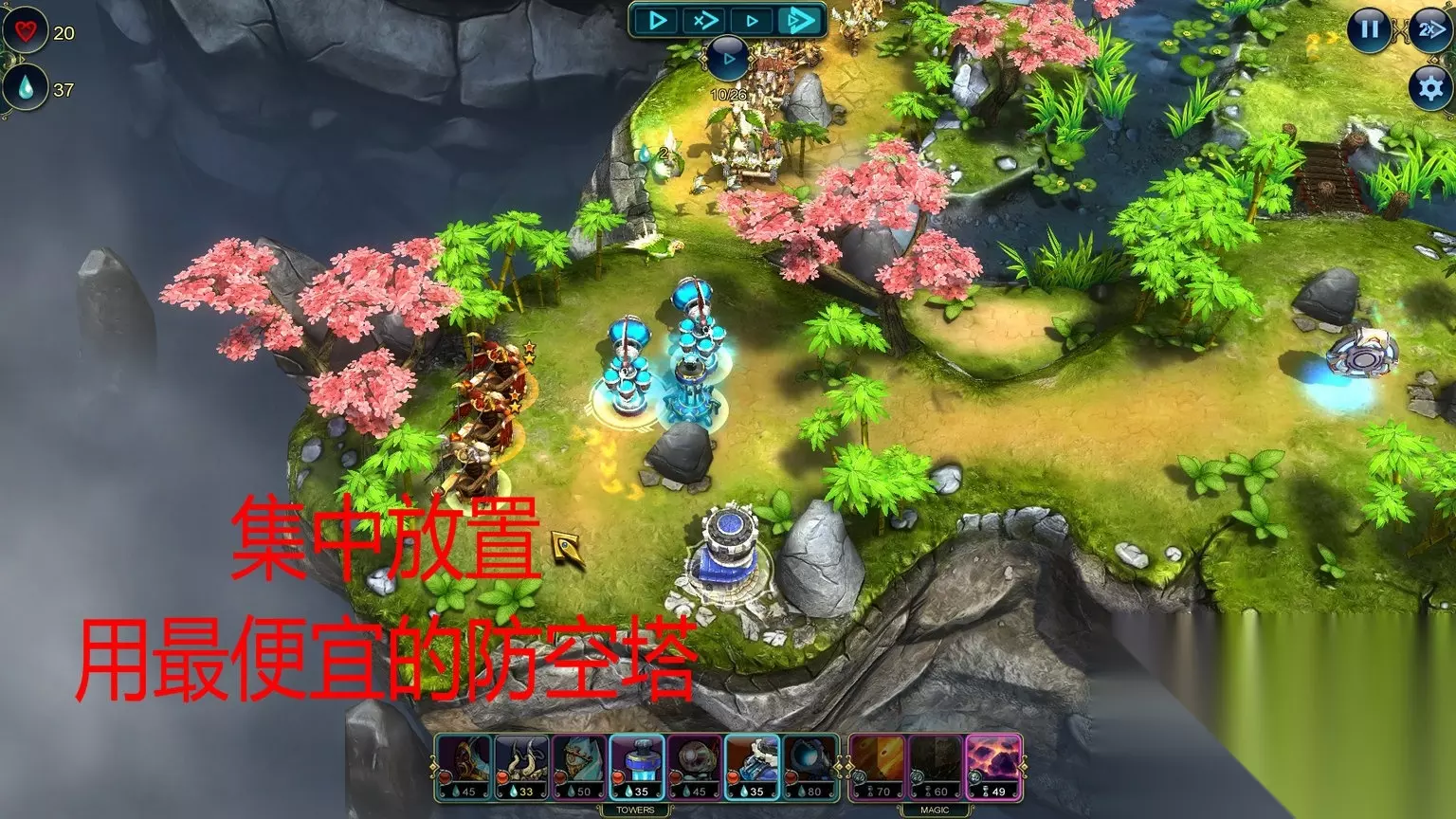 Master Strategist (Level 6) Complete the level without using the Wooden Tower. Totem Destroyer (Level 6) Destroy 7 totems. 不用木头塔,破坏7个占位塔。 初始的那5种塔都是木头塔,但这关要你不用的是箭塔,其他的木头塔还是可以用的。箭塔也是时候舍弃了,那个攻击力低的吓死人 Cold Calculation (Level 7) Complete this level with under 13 towers. Lesser Magic (Level 7) Complete this level using magic no more than 3 times. 通关造了至少13座塔/不用超过3次魔法(这游戏里面不超过包括了3次) Master Strategist (Level 8) Complete the level without using Magic light. Economical (Level 8) Save 200 Prime by the end of the level. 通关不用魔法/通关时候还剩最少200资源 Totem Destroyer (Level 9) Destroy all totems in the battle. Master Strategist (Level 9) Complete the level without using towers which target only air enemies. 破坏了所有占位塔/不允许使用只对空塔 No Magic (Level 10) Complete the level without using any magic. Master Strategist (Level 10) Complete the level without using the Fire Tower. 通关不用魔法/通关不用火塔 Master Strategist (Level 11) Complete the level without using the Siege Tower. Economical (Level 11) Save 150 Prime by the end of the level. 通关不用攻城塔/通关时候最少剩余150资源 Provocation (Level 12) Summon Next Wave 5 times in the battle. Only Pawns (Level 12) Complete the level without upgrading a tower. 快速呼唤敌人最少5次/通关不能升级塔 Mechanic (Level 13) Upgrade 5 towers to level 3. On the Verge (Level 13) Complete this level with 1 life. 升级5塔到3级/通关时候只剩1点生命 这关开始有恶心的成就,不过比起后面困难模式的来说就非常简单了 Battle Mage (Level 14) Inflict 5000 damage using magic. Builder (Level 14) Build 30 towers during battle. 用魔法造成5000点伤害/放置30座塔 如图把三个口子堵住,推荐使用炮塔、冰塔、攻城塔配合,有一裤衩资源富裕,足够通关前放30个堵路塔的。 这些魔法的伤害很高