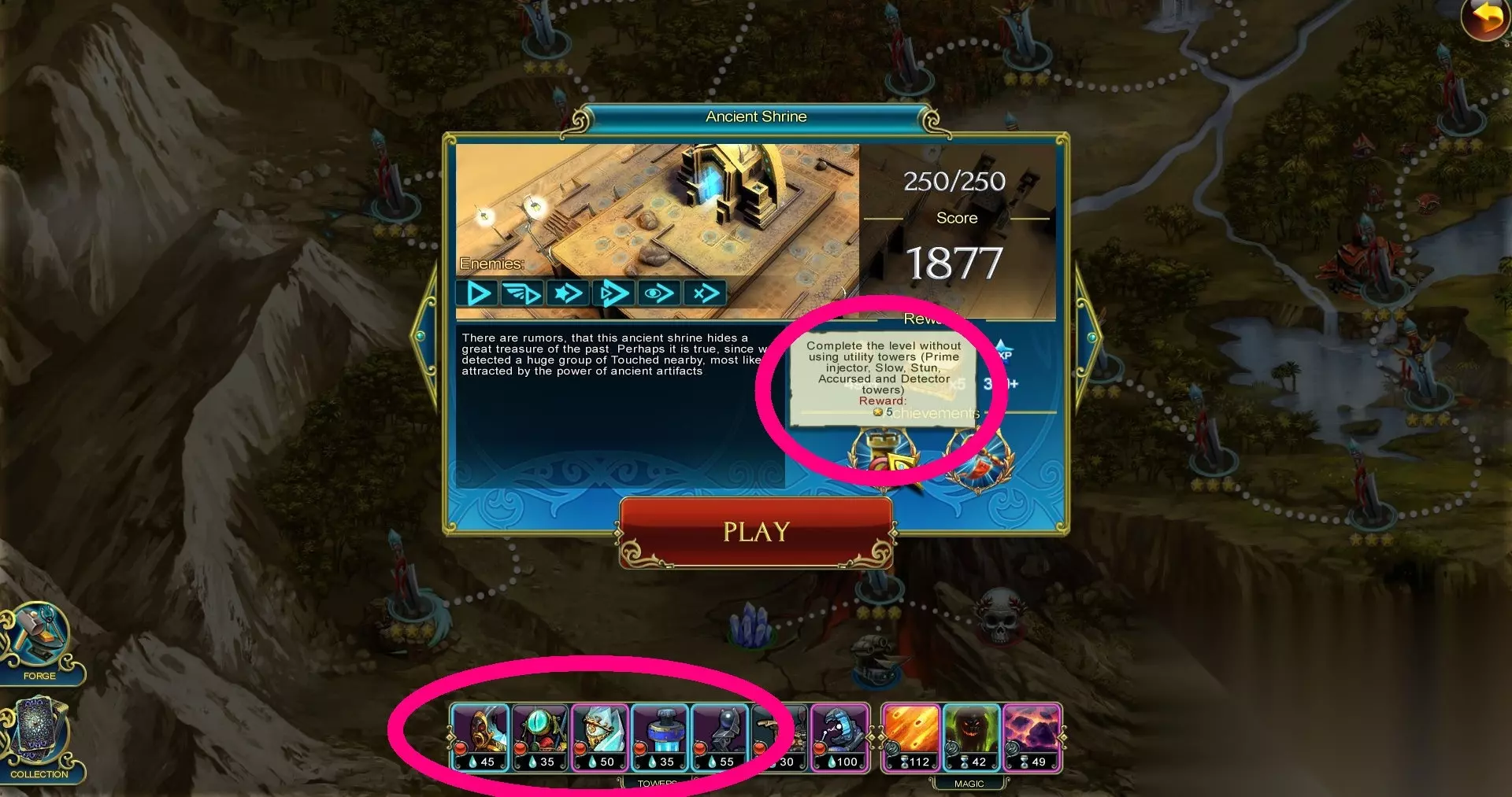 关卡赢5次,25次,100次,500次。推荐还是那个关卡去刷,想快速就用图上的配置,10秒一关。 Dismantler Sell 100 towers. 卖塔100次,BOSS关卖不了塔,就推荐在平时关卡快要通关时候卖吧 Mechanic I Upgrade 50 towers. Mechanic II Upgrade 300 towers. Mechanic III Upgrade 1500 towers. 升级塔50次,300次,1500次。升级1500座塔不难,按流程来看打通两个难度就能解锁。提示:一个塔是可以升级2次的,2次都算进去的,所以可以弄一个关卡专门放一堆升级1次的塔。 Annihilator of Totems I Destroy 40 totems. Annihilator of Totems II Destroy 200 totems. 破坏40/200个建筑,就是那个占位置打掉了给资源的塔 Master Strategist I Win 5 story levels on 3 stars. Master Strategist II Win 10 story levels on 3 stars. Master Strategist III Win 20 story levels on 3 stars. 5关3星,10关3星,20关3星,意味着要么一个模式全3星,要么困难模式也要刷几关,网上有位置图(虽然通关我的觉得这些位置图要么是开了修改器要么放的也就那样,本指南不会放所有关卡塔防图片,只放一些成就相关,仅供参考,希望大家可以自行摸索) 声明:233乐园网登载此文出于传递信息之目的,不代表233乐园赞同其观点或证实其描述,若侵权请来信告知,我们将及时处理。 关卡成就(普通难度) Wizard (Level 1) Use magic 5 times during the battle. Economics (Level 1) Save 100 Prime by the end of the level. 用5次魔法/通关时候还至少有100资源 推荐打到第5、6关左右的时候回头来做这个成就,木头塔的攻击力想存100还是挺麻烦的,开头只有一个CD 60秒以上的爆弹魔法想用5次也不现实,后面至少有了其他的塔和魔法再来做这2个成就。 Master Strategist (Level 2) Complete the level using no more than 1 Poison Tower. Provocation (Level 2) Summon Next Wave 3 times in a battle. 不用超过1个的毒药塔,快速开始下一波至少3次。 这种有特殊要求的塔我一般是打2到3次。一次拿3星,另外一两次专门用来获得成就的。 Totem Destroyer (Level 3) Destroy all totems during this battle. Master Strategist (Level 3) Complete this level without using more than 1 Slingshot. 破坏地图上的所有占位塔/不用超过1个的防空塔 这关空中敌军比较恶心,箭塔还打不了太多血,推荐后面融合了箭塔再来做成就。 Dismantler (Level 4) Sell 3 towers in one battle. Master Strategist (Level 4) Complete the level without using more than 1 Fire Tower. 卖3塔/不用超过1个的喷火塔 前面好办,专门开一关卖3个堵路塔就好,后面比较糟糕,这会火塔是手头上唯一一个面伤的,这关会出血少但是移动速度不漫而且成群的怪,没火塔打起来不是一般的难受。 Mechanic (Level 5) Upgrade 5 towers to level 2. Vow of Silence (Level 5) Complete the level without using magic. 5个塔升级到2,通关不用魔法。 和后面的BOSS1是同一张地图,推荐用堵口子,如下图。