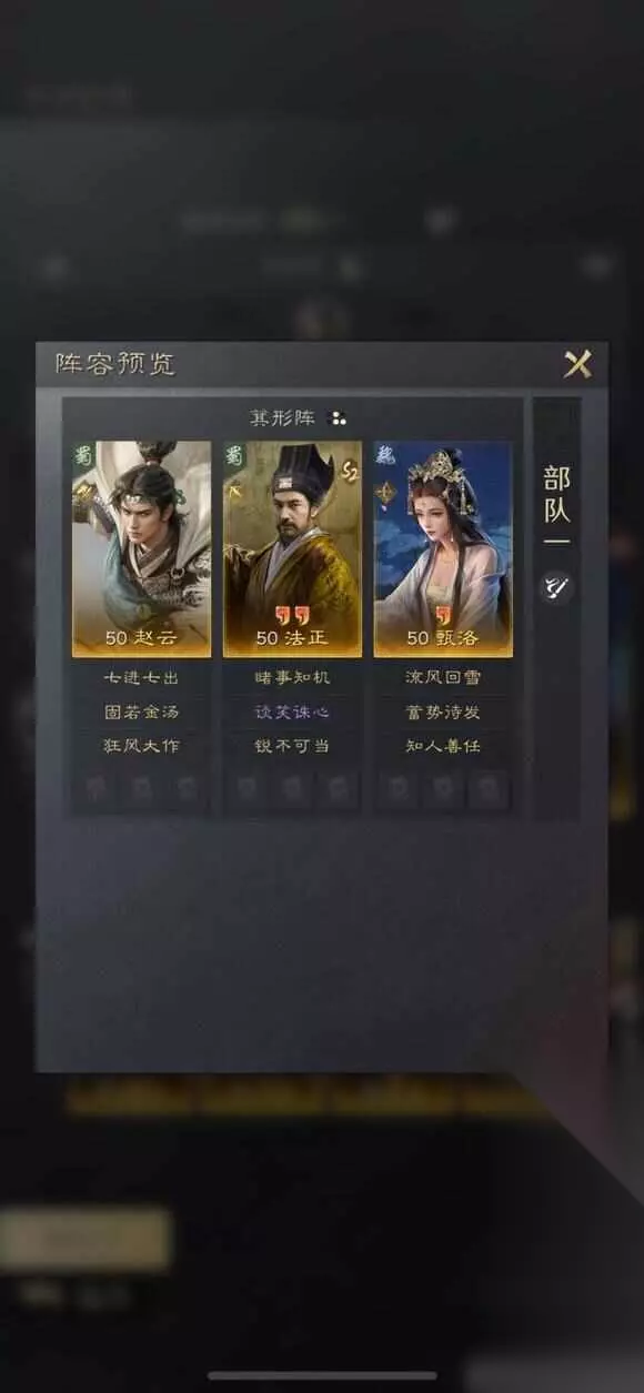 甄洛速度比较快,也可以舍弃防御技能知人善任,换个料事如神,加强对法师队伍的克制。 有兴趣的玩家们可以来试试这一套阵容哦,主要的核心主角是法正,拥有他基本可以事半功倍了,并且拥有不错的战绩呢,尝试新流派玩法吧!