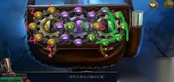 第六步:移动中央太阳 如果中央圆圈上有太阳图案,将其旋转到交叉口B处。 第七步:关键旋转 进行以下旋转:左侧圆圈逆时针旋转1次,中央圆圈顺时针旋转2次,左侧圆圈逆时针旋转1次。 第八步:处理叶子 现在,忽略其他图案,只关注右侧圆圈和绿色叶子图案。 第九步:排列叶子 将五个叶子图案排列到右侧圆圈上,并在中央圆圈上保留一个叶子图案,如下图所示: