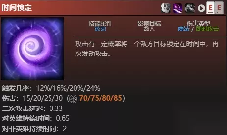 与其他重击不叠加, 碎颅锤和 深渊之刃的重击会被禁用,在技能征召中,与来自碎颅锤与深渊之刃的重击完全叠加。 触发的攻击先施加debuff,再造成其自身的伤害。 时间锁定对友方单位有效,对守卫和建筑无效。 触发时,施加眩晕debuff。0.33秒后,施加二次攻击和伤害。时间锁定使用伪随机分布。 反时间漫游