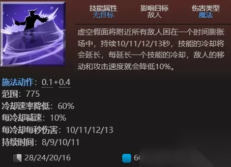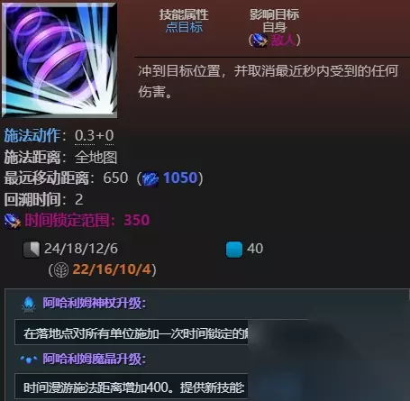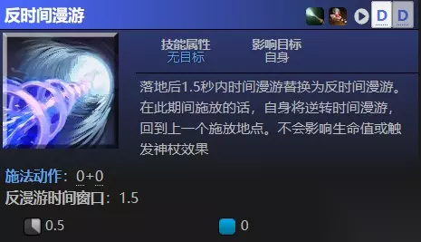 时间漫游移动虚空假面的速度为3000,虚空假面在时间漫游期间是无敌的 施法时不躲避弹道,选择比最远距离近的地点使用时不会移动全额距离,施法时,虚空假面在前秒内受到的任何伤害都会被治疗回来,包括友军造成的伤害。由于是一个治疗,因此完全受治疗调整影响 只回溯3种伤害类型,治疗和生命移除不会被回溯,这意味着不能回溯像:魂断,虚妄之诺,灵魂之戒和莫尔迪基安的臂章这样的东西,状态buff和debuff,冷却和魔法完全不受影响。 升级后,对目标点350范围内的每一个敌人强制触发时间锁定。不会通过即时攻击来触发时间锁定,而是对敌人施加强制触发特效,使时间锁定对他们触发。驱散该debuff不会移除时间锁定的眩晕,但是可以阻止发生时间锁定的即时攻击。 时间膨胀