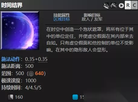 虚空假面及其幻象(包括其自身,敌人或友军的幻象)不能被时间结界冻结,无视来源,这是虚空假面的天生能力,但是,极速和相位移动只有施法者及其单位可以获得,在技能征召,虚空假面即使在没有征召到该技能时也会保持对时间结界的天生免疫。 在持续时间内提供整个受影响区域的空中视野和真实视域。 施加控制debuff时打断该单位大多数强制移动来源。 回到过去