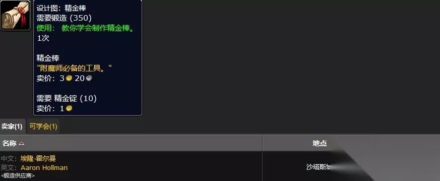 在魔兽世界这款游戏中,锻造精金棒图纸的购买地点是沙塔斯城的贫民窟。玩家在靠近占星者之台的贫民窟区域中找一个叫做埃隆·霍尔曼的NPC,该NPC是锻造供应商,玩家可以在该NPC的商店中购买到设计图:精金棒。