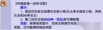2.变异马面造型的变异鬼;第一回合一个己方单位使用单体技能单点提示所说的小怪,其余己方单位使用单体技能单点主怪,第二回合会自动结束。
