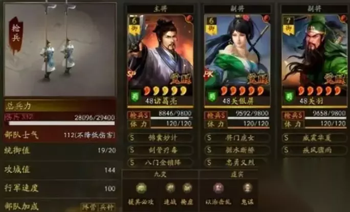 阵风风暴父女枪法组合指南 诸葛:刮骨解毒+八门金锁/高端装备暂时避锋 关妹:忠勇正义+拒水断桥/高品质装备横扫万军 关羽:狂风大雨+压倒性的威势 诸葛:支援他必须进攻+速战+掩饰弱点 关梅:用规则+魔法+阴谋对抗混乱 关羽:以治+阴谋+将军之力破乱 诸葛:辅助他一定的攻击配合刮骨、毒疗可以给队伍带来更好的减伤。快速战斗保证了出手速度,让输出位置获得激活率加成,覆盖弱点减少自身伤害! 关梅:虽然没有什么嚣张气焰,但是有了SP诸葛的加持,一智在联动上还是很自如的。幽灵方案伤害进一步提升,神机独领风骚,产生耀眼的伤害输出表现!