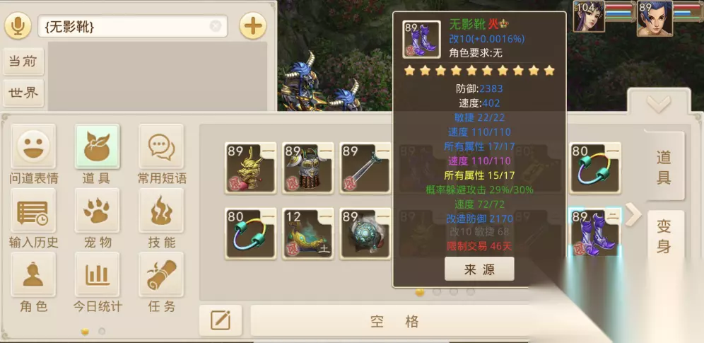 很完美的法水武器坯子,不仅粉黄属性都是极品,更是绿出了可遇而不可求的强水法伤害10%,绿属性距离满暗伤也仅差5点伤害。 这把武器就像刚铸成的寒铁宝剑,虽未开锋,却寒气逼人,只要完成最后的淬炼开刃,便能一飞冲天,伴随道友征战中洲! 完美度:★★★ 奇葩值:★★★ 稀有值:★★★★★ 概率躲避攻击29%鞋子 二〇一六-某道友 看我这双89的极品跑鞋!