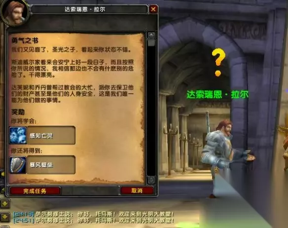 3、击杀完后返回暴风城光明大教堂,找达索瑞恩·拉尔提交任务。