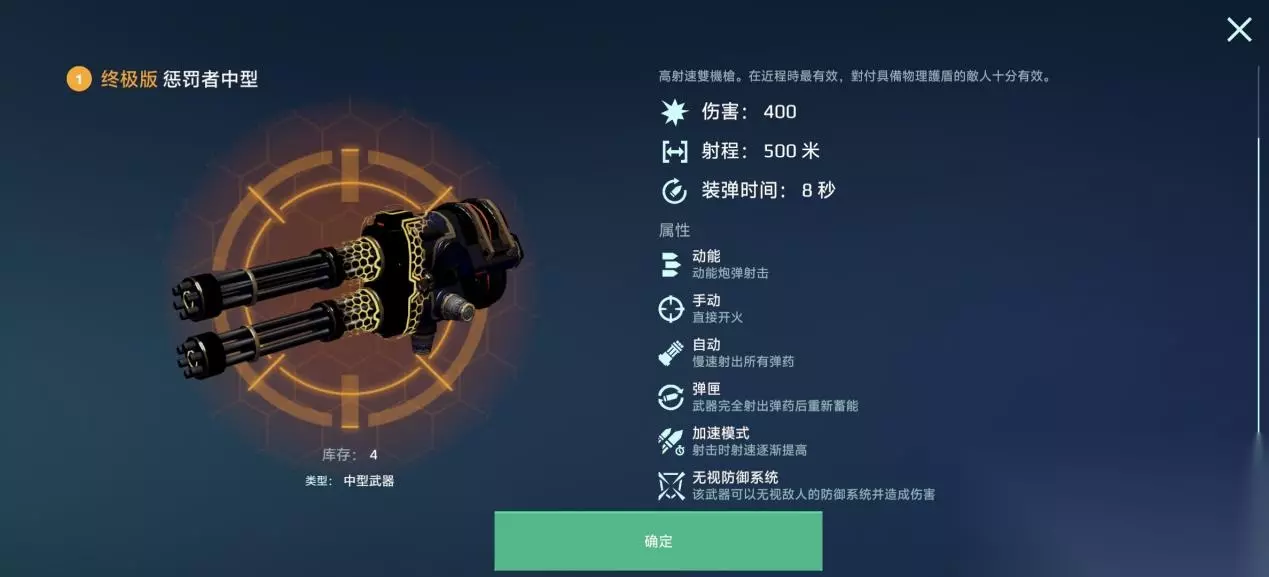 (数据信息请以游戏内展示为准) 高伤破甲 致命破防 [终极版惩罚者中型] 采用动能射弹设计,对物理护盾能造成额外伤害,同时保留了机枪类武器 “射速随射击时间提升” 的核心特性,火力迅猛。 相较于 [粒子发射器] 等同类机枪,它的单发伤害更为出色,持续 DPS稳居前列,对目标的摧毁效率极高。而与常规机枪武器及标准版 [惩罚者中型] 相比,其独有的 “无视防御” 特殊效果,让机甲在面对具备免伤能力的目标时,也能稳定输出伤害,避免因防御减免导致的输出断层。