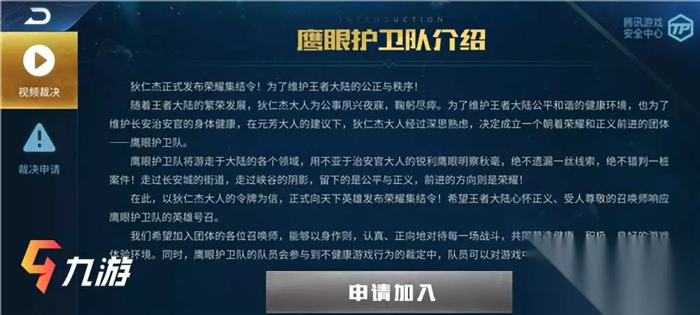 王者荣耀中,不少小伙伴们都想要加入鹰眼护卫队,加入护卫队之后既能检查其他人的游戏行动,又能得到不菲的奖励报酬,不过王者荣耀鹰眼护卫队怎么申请加入,估计一些小伙伴们还不清楚吧,这里就来说一下具体的加入方法以及注意事项。