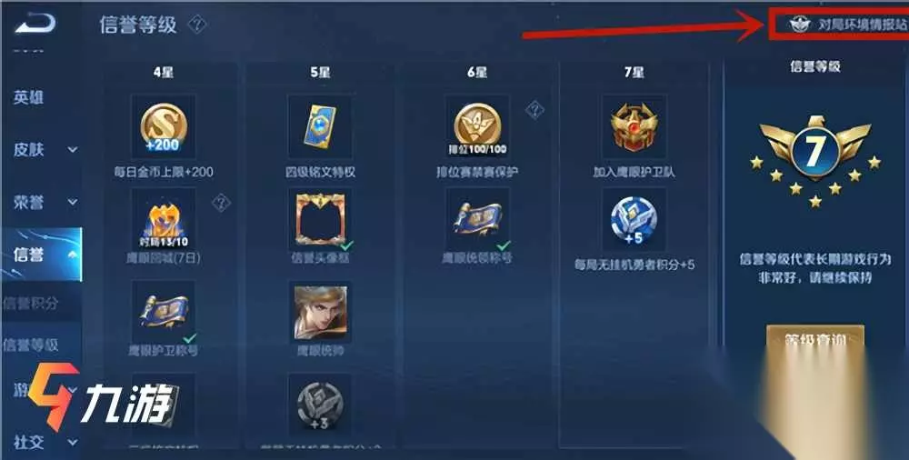 鹰眼护卫队加入方法 1、小伙伴们想要加入鹰眼护卫队的话,首先打开个人主页的【信誉】,点击其下的【信誉等级】,在信誉等级页面的右上方位置可以看到一个【对局环境情报站】的图标按钮;