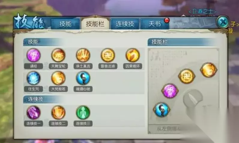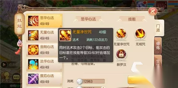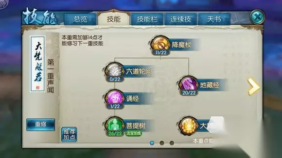 二、熟悉技能情况及加点 该门派技能进行加点形式也是多样化的,可以先来看比较常规的技能加点形式,普通攻击降魔杖,只需要加一点将后续技能引出就好了,然后就是地藏经,因为天音的命中率是比较低的,所以这个必须点满,点满之后就可以有效提高他们的命中了,诵经是一个远程技能,PK的时候很好用,也是必须加点的,菩提树这个技能需要点上,被动可以加很气,这种加点方式是比较通用的,可以说是适用性比较强的一套,能适用于大部分的情况和任务的。