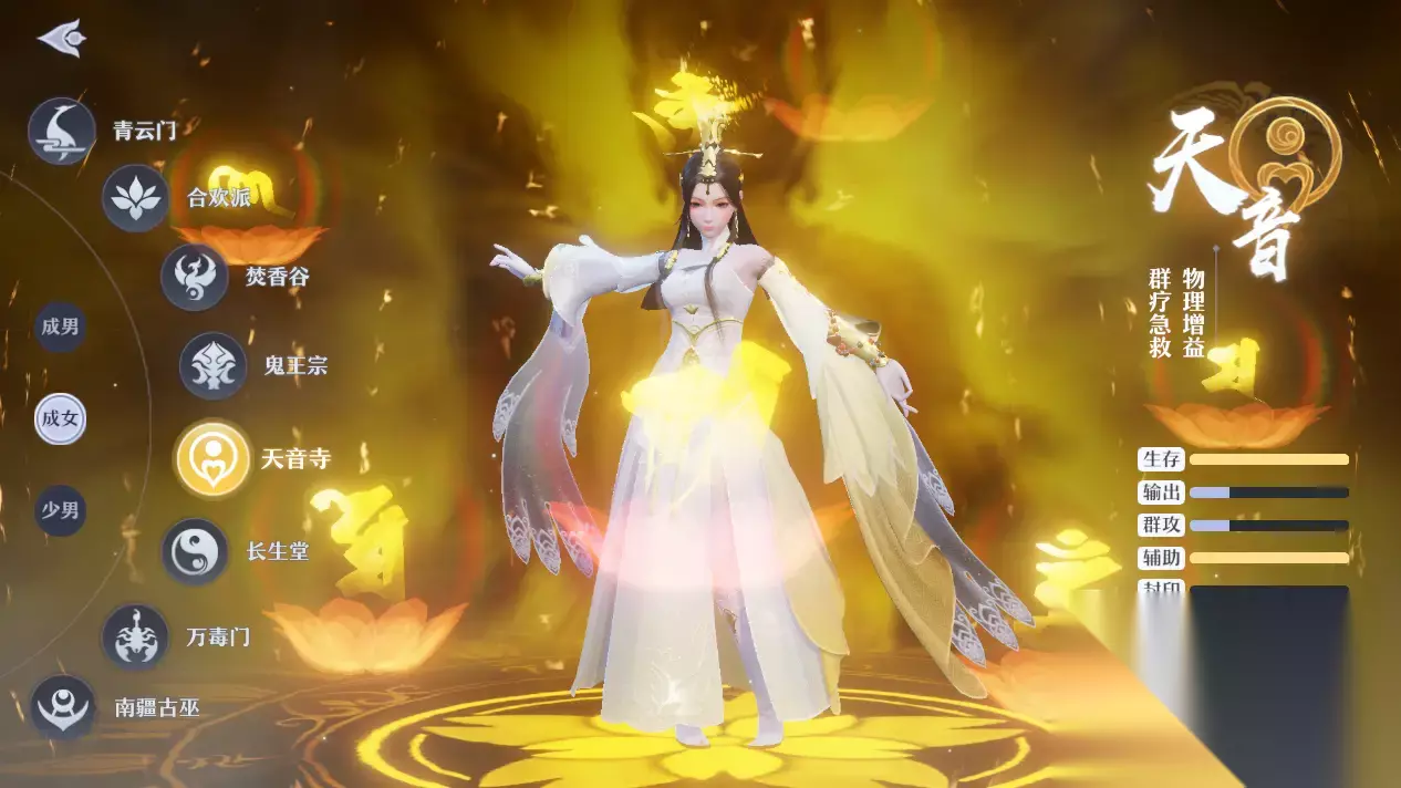 一、门派情况简介 这是一个根据原作品进行改编的游戏,而天音寺在原作当中是一个佛教圣地,悬壶济世就是宗门的宗旨,致力于普度众生,在游戏当中也将这个门派进行了高度的还原,首先他们的形象都是温文尔雅,片片君子的形象,外表看起来雍容华贵,稳重典雅。他们修炼以真气固本培元,不受外力侵害。 游戏当中,他们拥有法术攻击能力,当然也有辅助能力,一般哎门派是以辅助为主的,具备一定远程输出的能力,但是群体控制以及治疗能力更加强大,这个门派蛮适合新手去玩的,当然尤其适合平民玩家,他们的培养资源和要求并不是很苛刻,所以适合0氪选择。